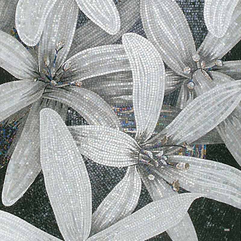 イタリア、ラヴェンナのモザイク職人が、すべてモザイクのハンドワークによって描いた美しい花々です。べネツィアンガラスの鮮やかな色彩によって表現された花たちは、透明感のある煌びやかさをもっています。熟練した職人が絵柄に合わせ、ベネツィアンモザイクを1枚1枚手割りして繊細に描いたモザイクアートです。