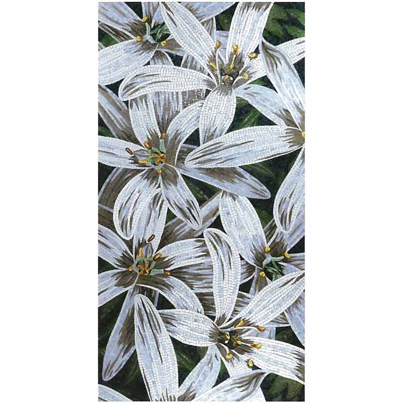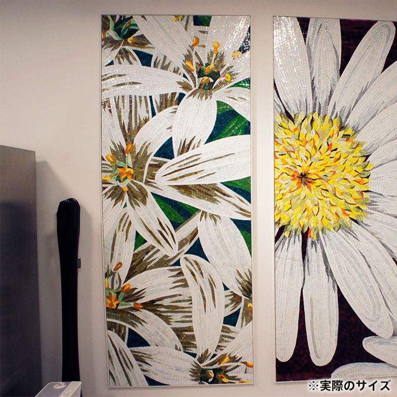 イタリア、ラヴェンナのモザイク職人が、すべてモザイクのハンドワークによって描いた美しい花々です。べネツィアンガラスの鮮やかな色彩によって表現された花たちは、透明感のある煌びやかさをもっています。熟練した職人が絵柄に合わせ、ベネツィアンモザイクを1枚1枚手割りして繊細に描いたモザイクアートです。