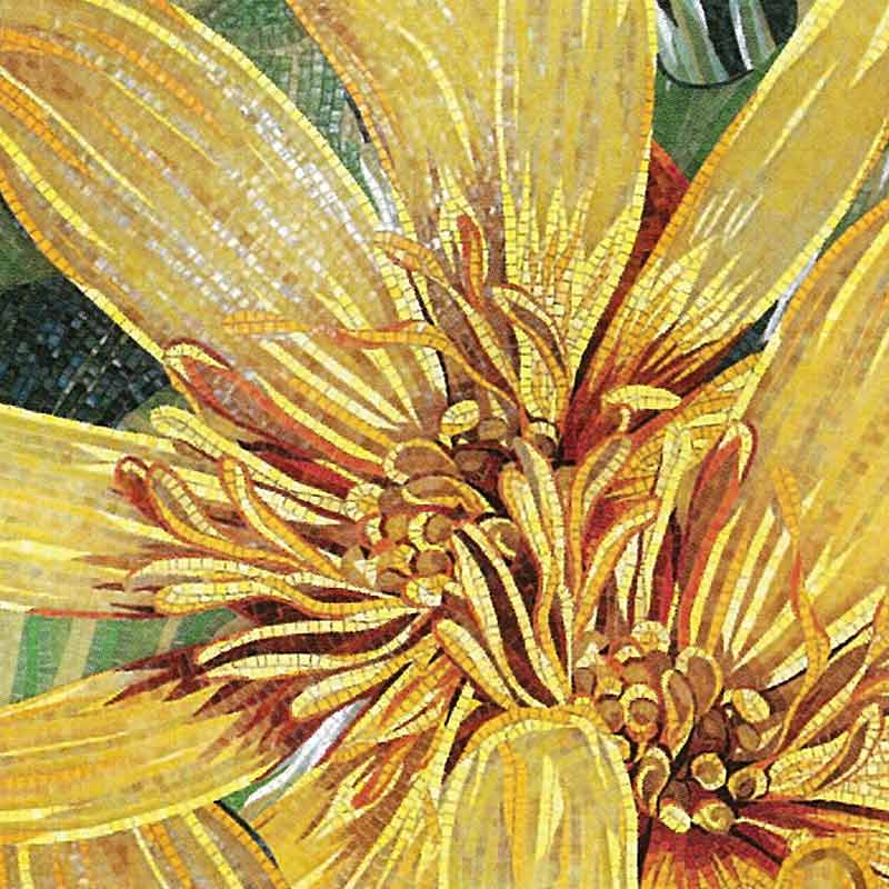 イタリア、ラヴェンナのモザイク職人が、すべてモザイクのハンドワークによって描いた美しい花々です。べネツィアンガラスの鮮やかな色彩によって表現された花たちは、透明感のある煌びやかさをもっています。熟練した職人が絵柄に合わせ、ベネツィアンモザイクを1枚1枚手割りして繊細に描いたモザイクアートです。