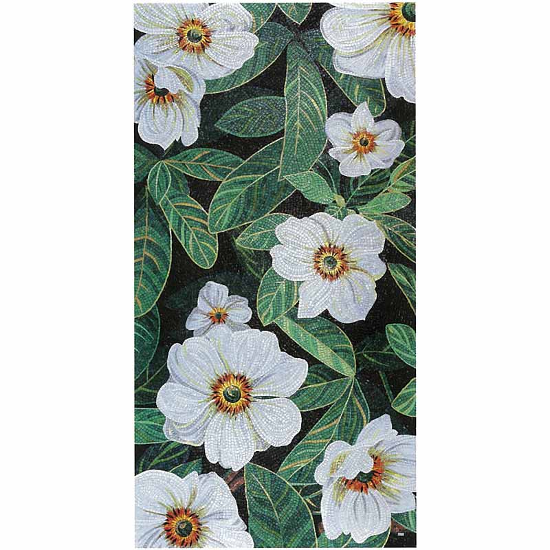 イタリア、ラヴェンナのモザイク職人が、すべてモザイクのハンドワークによって描いた美しい花々です。べネツィアンガラスの鮮やかな色彩によって表現された花たちは、透明感のある煌びやかさをもっています。熟練した職人が絵柄に合わせ、ベネツィアンモザイクを1枚1枚手割りして繊細に描いたモザイクアートです。