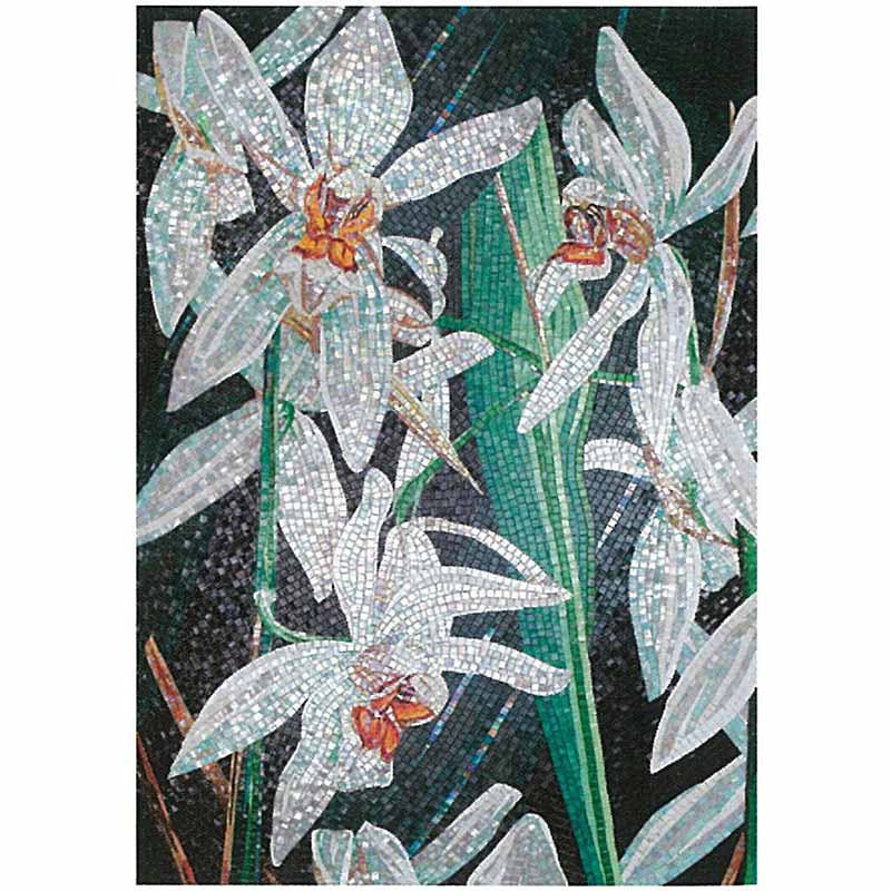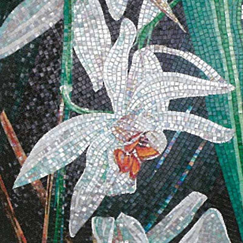 イタリア、ラヴェンナのモザイク職人が、すべてモザイクのハンドワークによって描いた美しい花々です。べネツィアンガラスの鮮やかな色彩によって表現された花たちは、透明感のある煌びやかさをもっています。熟練した職人が絵柄に合わせ、ベネツィアンモザイクを1枚1枚手割りして繊細に描いたモザイクアートです。