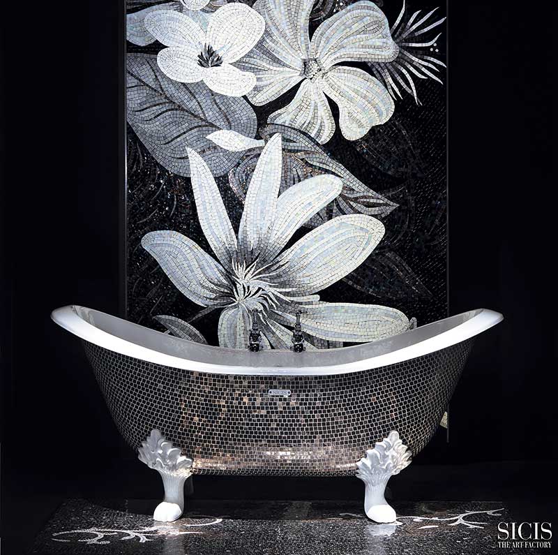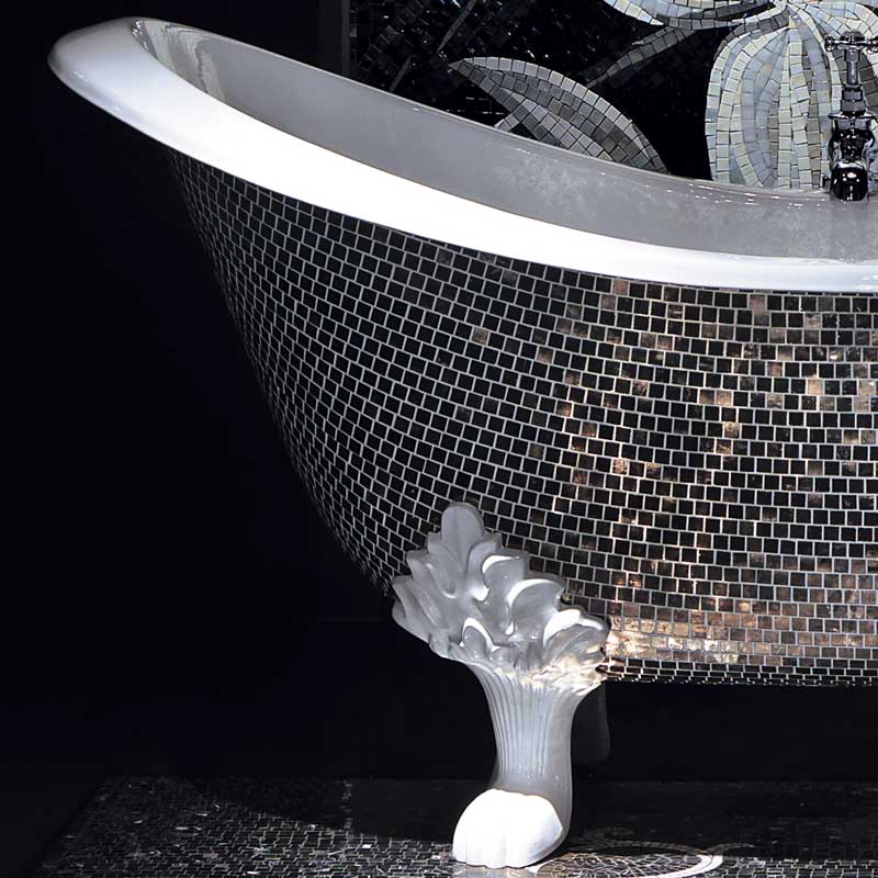 美しく輝くタイルを贅沢に施した、クラシカルでエレガントなバスタブです。タイルの見せる魅惑的な表情が優美なシルエットと融合し、非日常の世界感をつくりあげます。