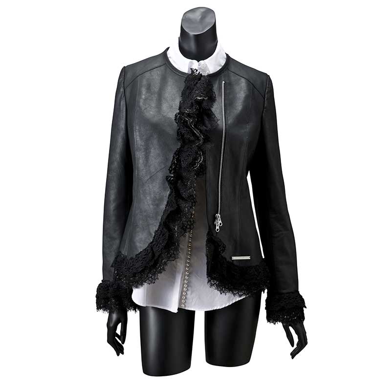 3層のレースがアクセントにした、ショート丈のレザージャケット。