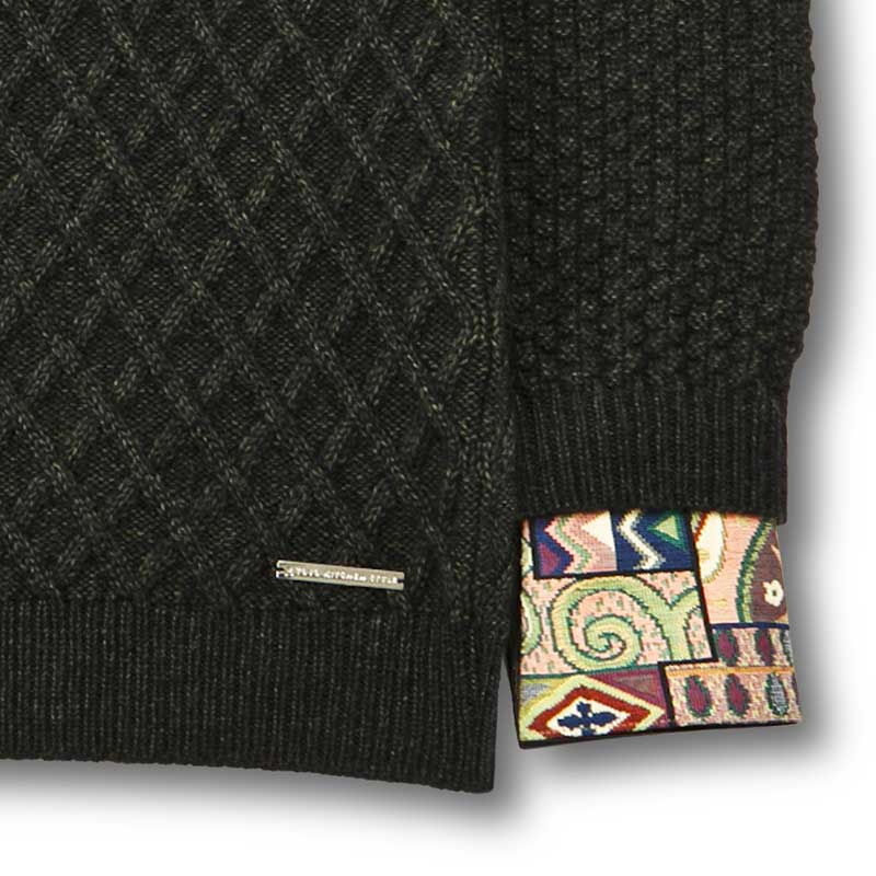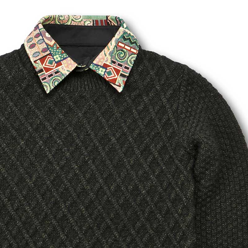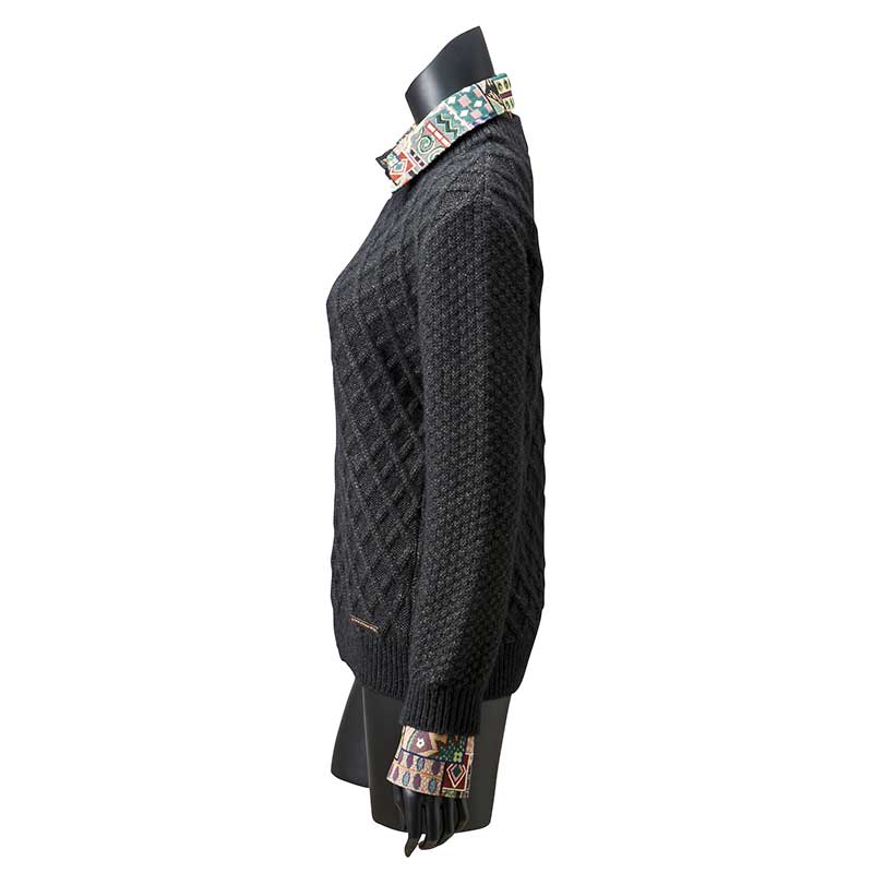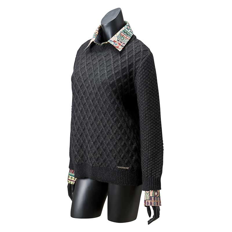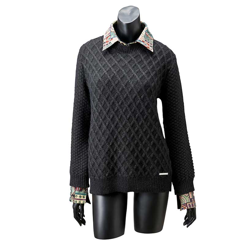 ベイビーアルパカの毛糸で編んだニットには、フェイクな要素が隠れています。