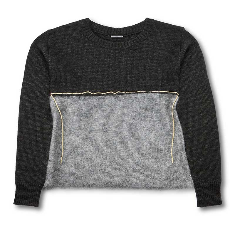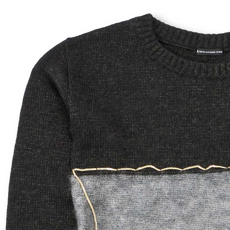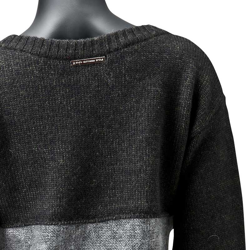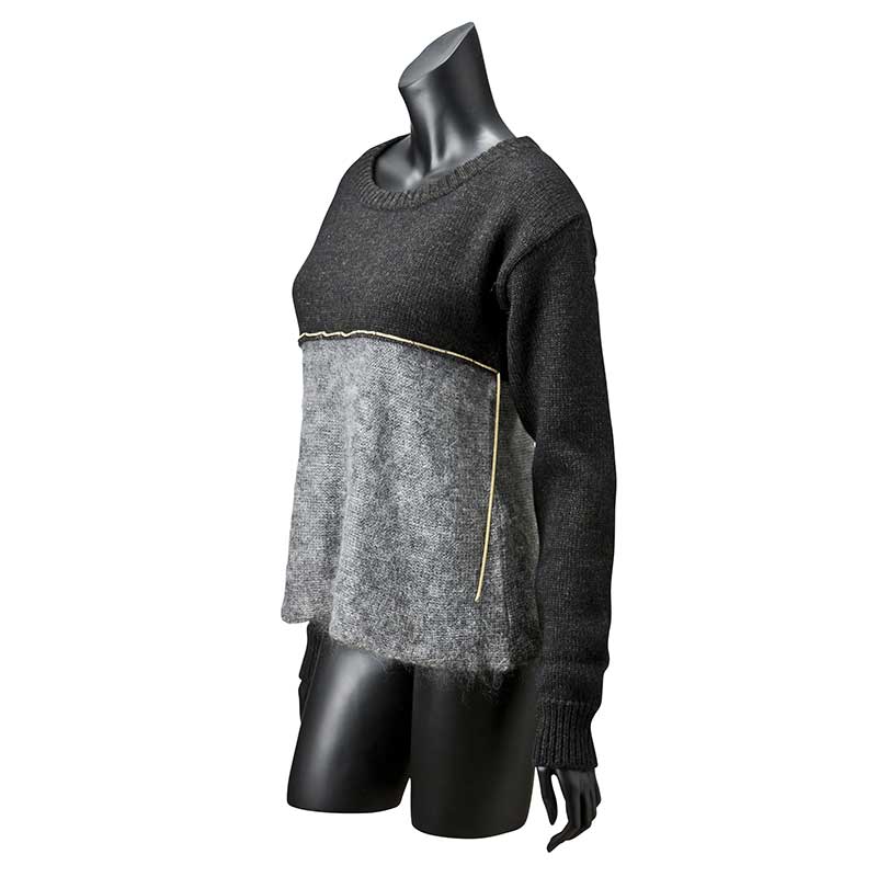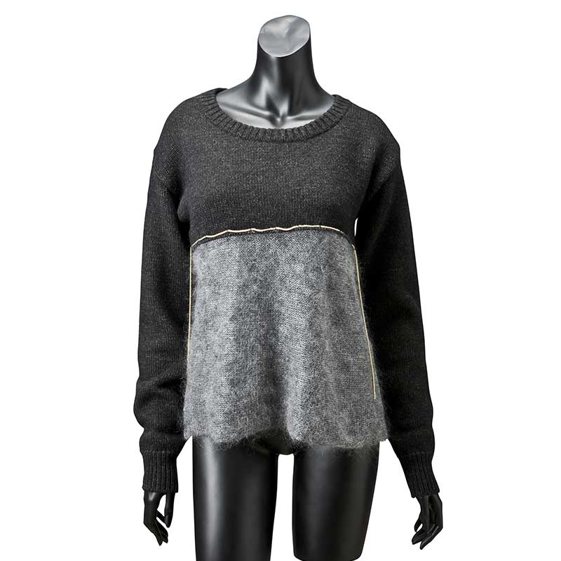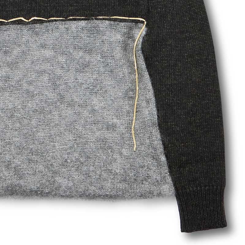 ゴールドカラーのチェーンを境に、2色のコントラストが際立ったツートンカラーのニット。