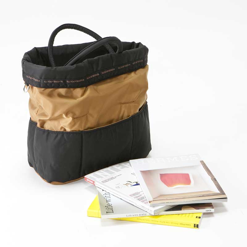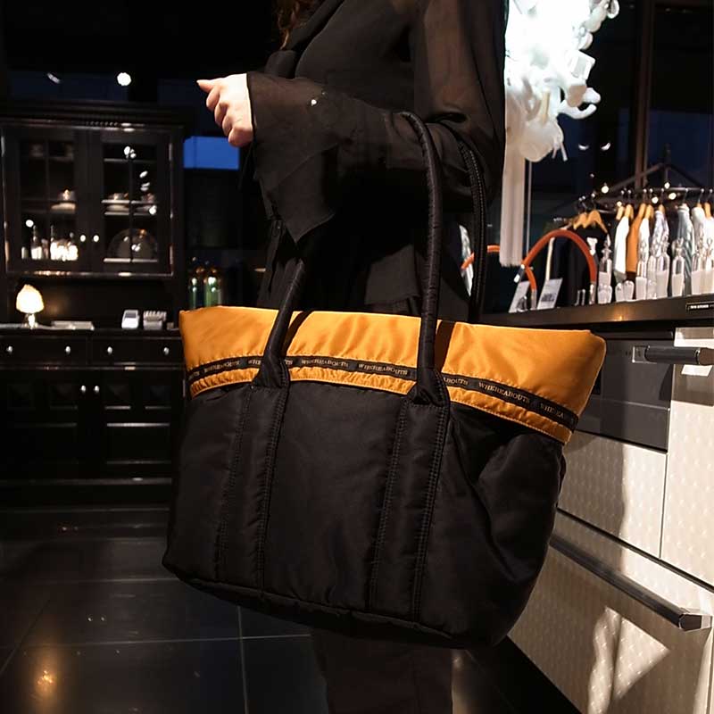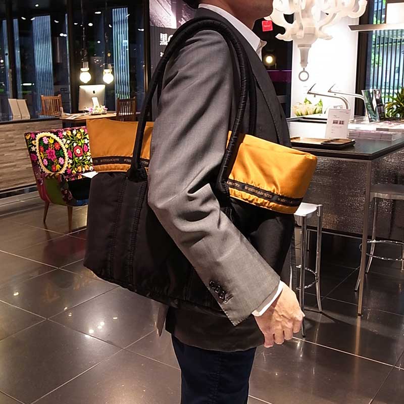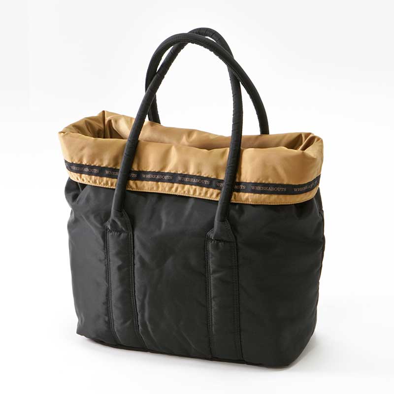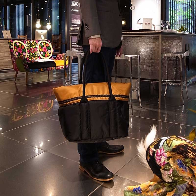 光沢のあるナイロン素材を使用したリバーシブルトートバッグ。