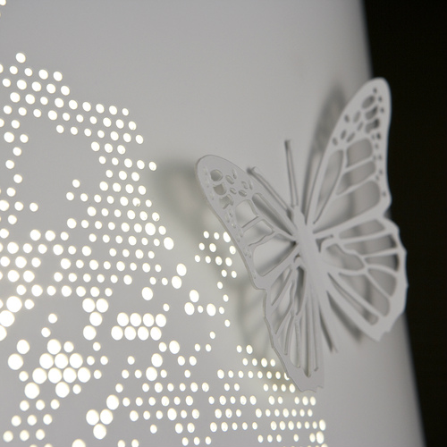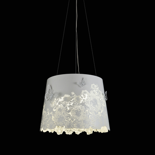 カラーとフォルムはシンプルながら、シェードに装飾に加えた可愛らしいペンダント照明。シェードに施された蝶がフォルムに立体感を与えています。様々な空間にコーディネートし易く、空間のアクセントとして使うことが可能です。スチール製。蝶のアクセサリはマグネットで色々なところにアレンジできます。