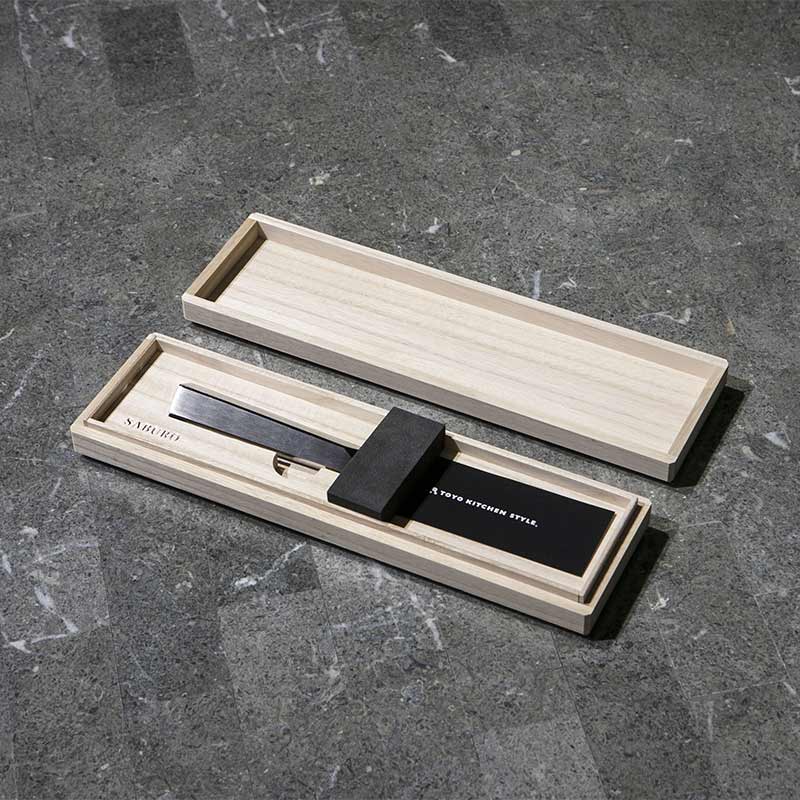 1本ごとに専用の桐箱に入れてお届け致します。包丁などの刃物は古来より贈答品として親しまれてきました。人生・運命をを切り開いていく象徴として、刃物は神聖で縁起の良いもの。人生の節目やお祝いごとでのプレゼントとして最適です。