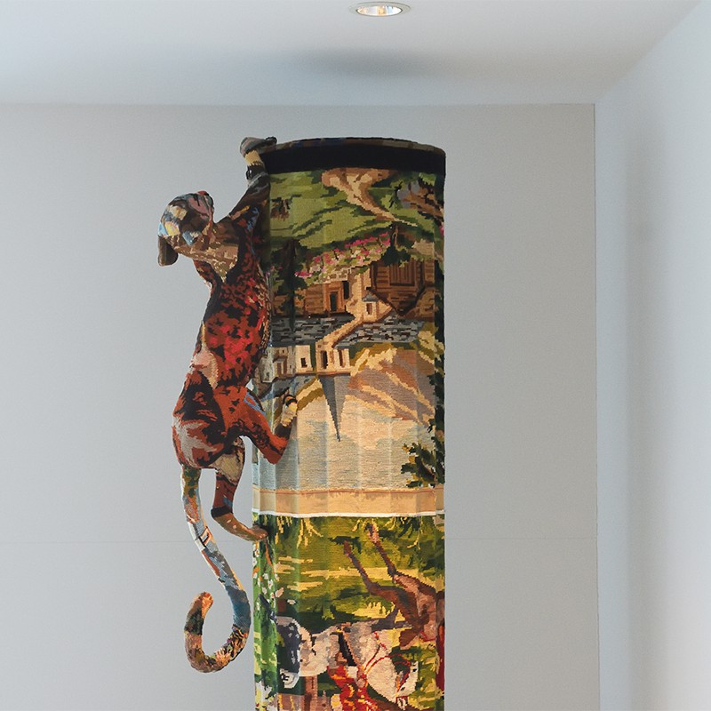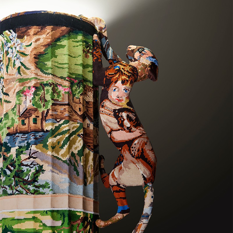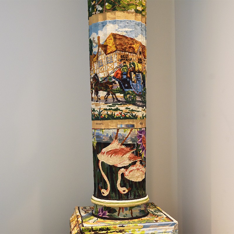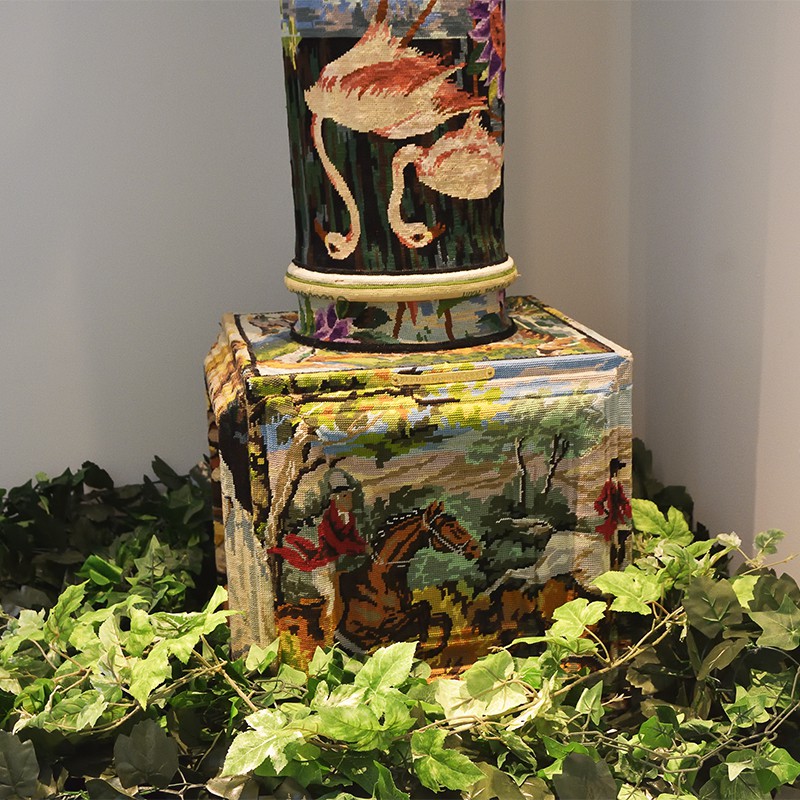 キャンパス生地全体をウールの糸で刺繍を施す技法。仕上がりはまるで織物のような印象で、ウール糸を使用することから、タペストリーとして装飾として用いるだけでなく。室内の温度調整の役割も果たす実用性も兼ね備えています。