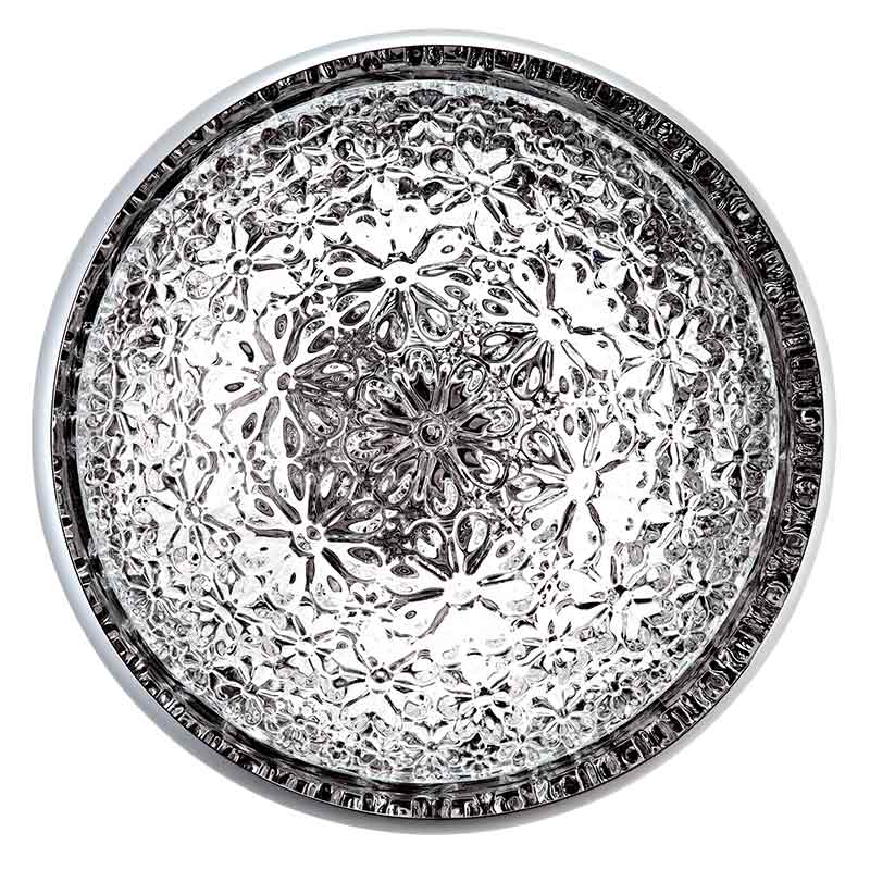 ペンダント照明「Valentine(バレンタイン)」のシェードは、クリスタルガラスと金属の異素材を組み合わせて構成されています。シェード外部に用いられたクリスタルガラスからは、点灯時に優しい光を放ちます。シェード内部のクリスタルに施された無数の花のパターンが、ベースのミラーに映り込むことで、より立体的に浮かび上がり、不思議な世界観が広がります。