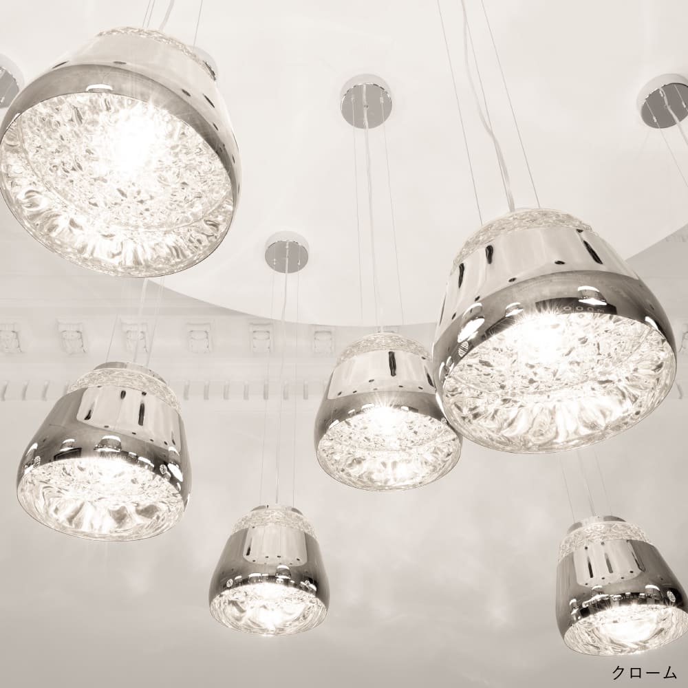 クリスタルガラスと金属の異素材を組み合わせて構成されたペンダント照明。