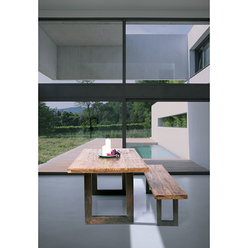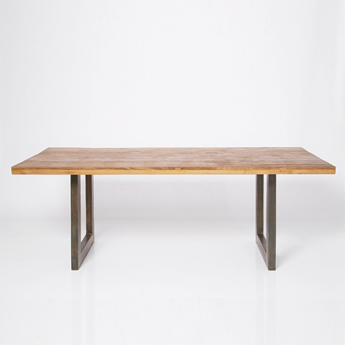天板にはチーク材、脚部はアイアンを採用したテーブルです。公園やキャンプ場で使われているような機能的フォルムが特徴です。フレキシブルに対応できる、直線だけで構成されたシンプルなデザインです。