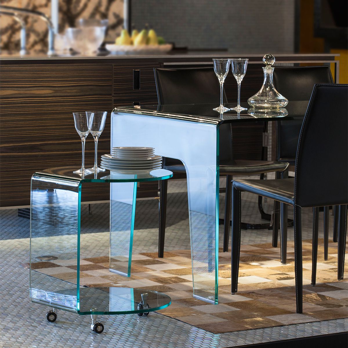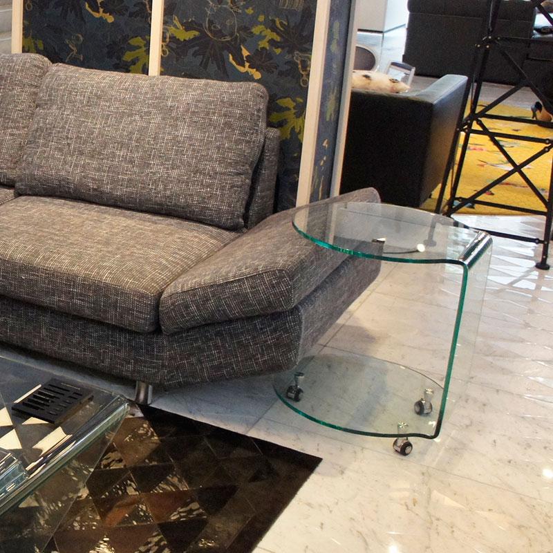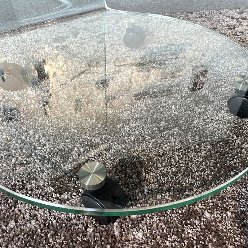 床が見通せるので、ラグのデザインを最大に活かすことが出来るとともにガラスの持つ少しクールな印象も和らぎます。