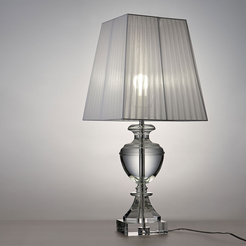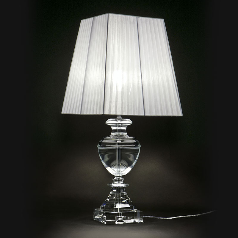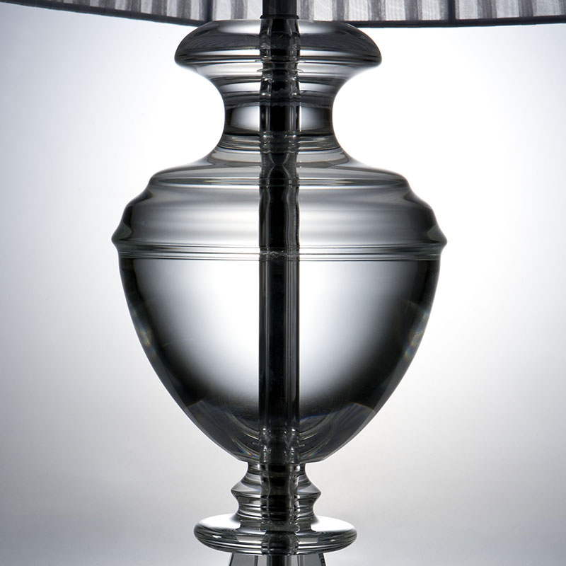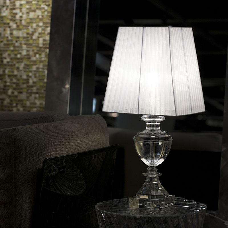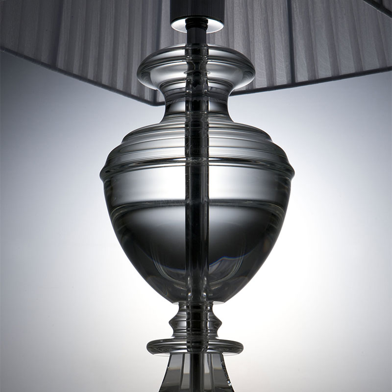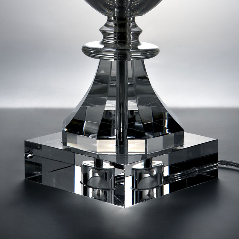透明なクリスタルガラスでできた支柱部分が特徴のテーブルランプ。