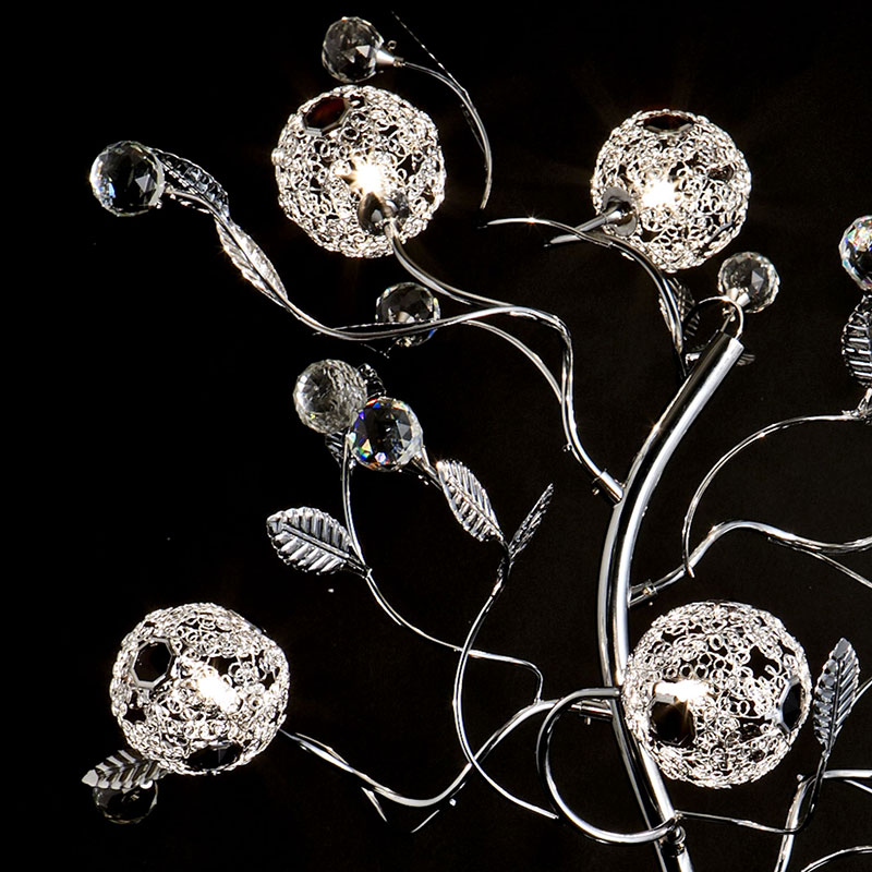 不規則に伸びた枝にシルバーの葉とクリスタルの果実がみのり、花には赤いクリスタルが咲いています。