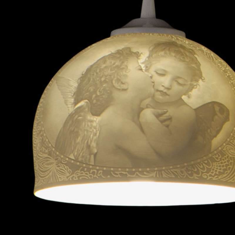 ポーセリンの厚みを変えることで、シェード部分の繊細なレリーフが浮かび上がる磁器製のペンダントランプ。