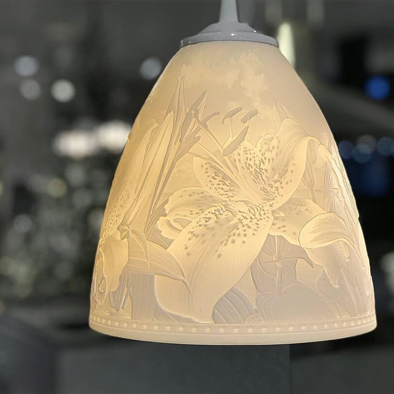 ポーセリンの厚みを変えることで、シェード部分の繊細なレリーフが浮かび上がる磁器製のペンダントランプ。
