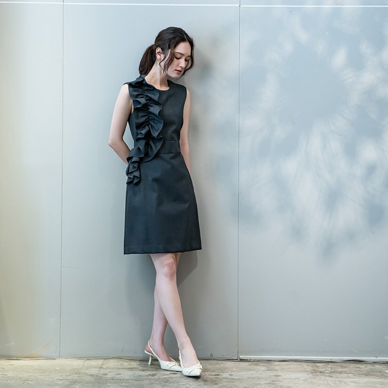 立体的に仕上げたフリルが印象的なワンピース。ウエストの切り替えがスタイルアップを演出します。