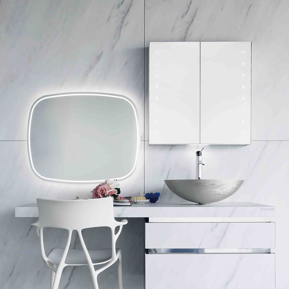 ミラーの両側にLED照明が点在し、影を作る事なく姿を照らすハリウッドミラータイプです。