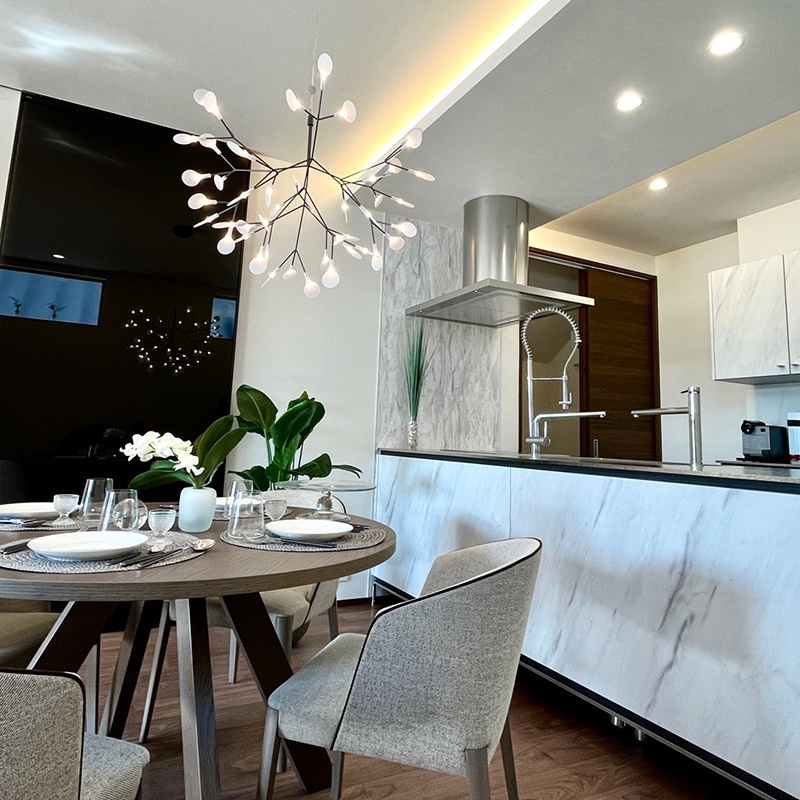 標準サイズまたはスモールサイズを、ダイニングテーブルから60?80cm程度の高さに吊るすのが理想的です。枝の抜け感により圧迫感がなく、食事中の会話も自然に弾みます。北欧スタイルやモダンインテリアとの相性が抜群です。