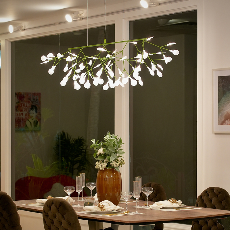標準サイズまたはスモールサイズを、ダイニングテーブルから60?80cm程度の高さに吊るすのが理想的です。枝の抜け感により圧迫感がなく、食事中の会話も自然に弾みます。北欧スタイルやモダンインテリアとの相性が抜群です。