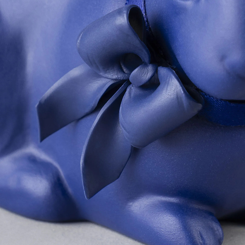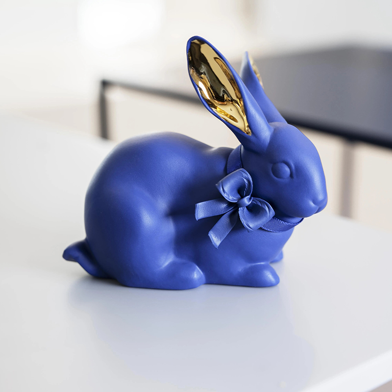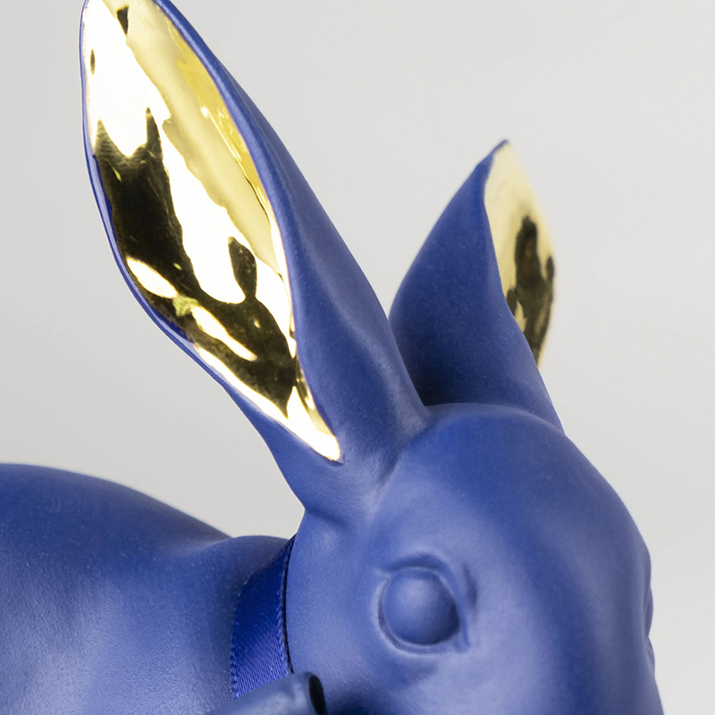 首元に結んだ大きなブルーのリボン、長い耳は金彩で華やかに仕上げられています。