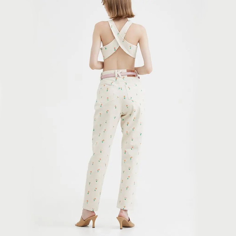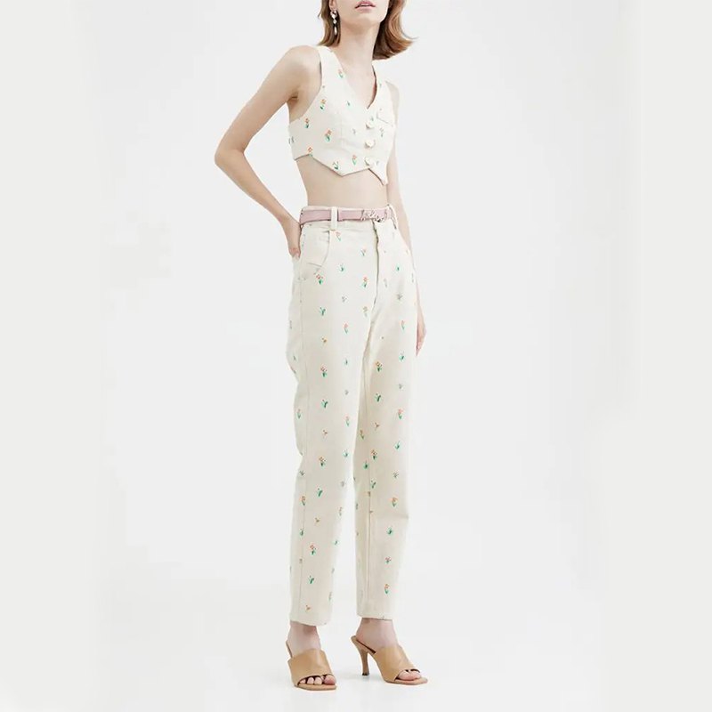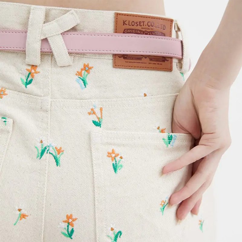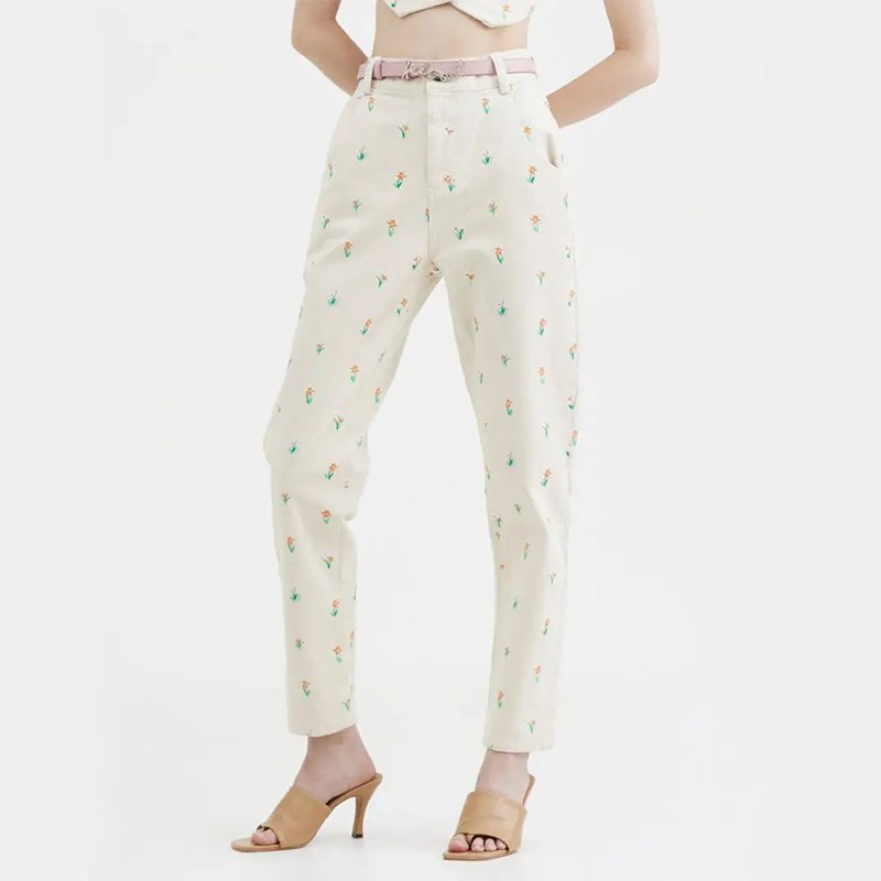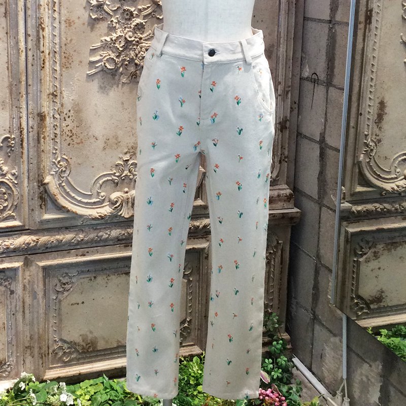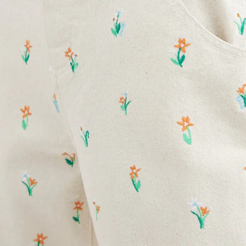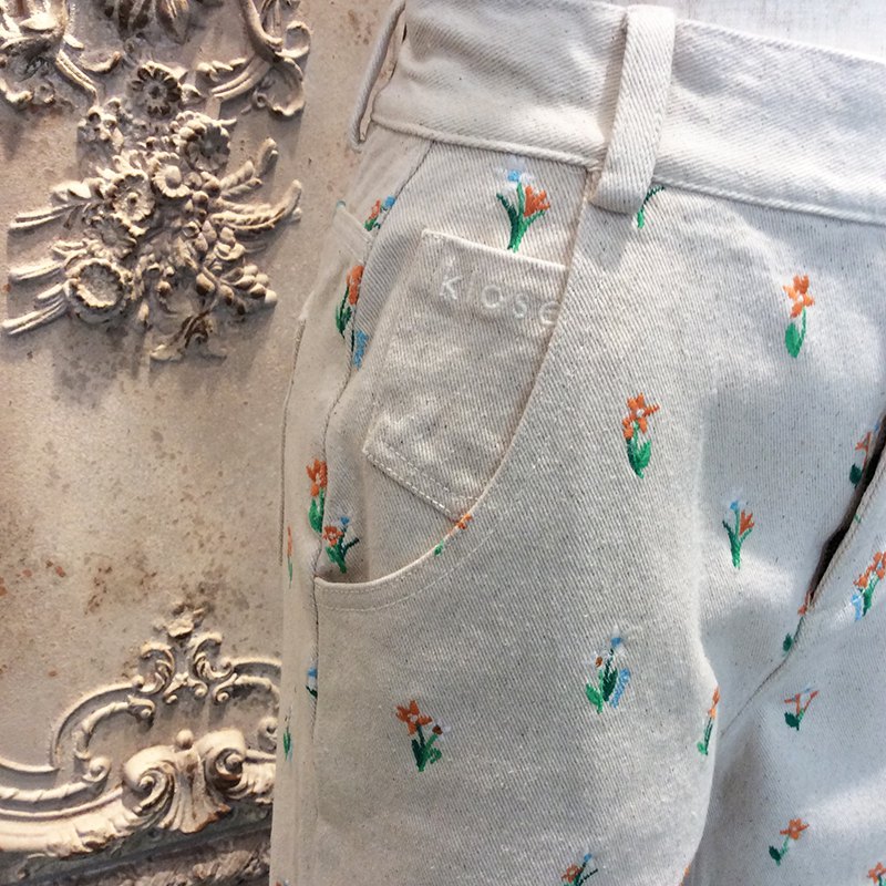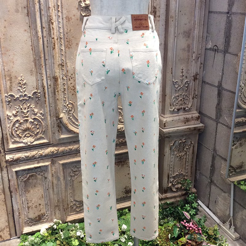 コットンデニム系のしっかりとした中厚の素材に、全体的に可愛らしくお花の刺繍のパンツです。