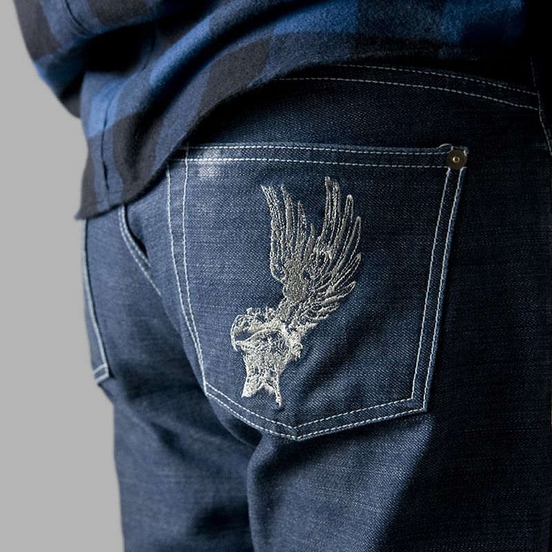 右後ろのポケットにブランドロゴの刺しゅう入り。トルファン綿は中国の新疆ウイグル自治区トルファン産。