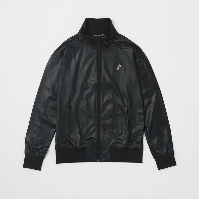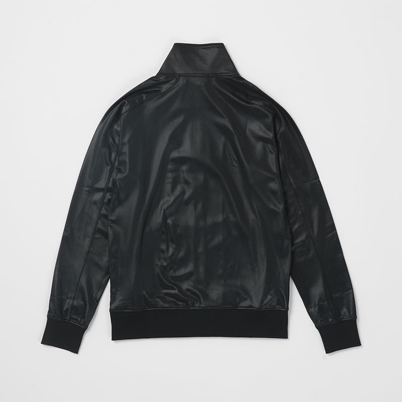 レザーのような質感の光沢加工を施したポリエステルジャージを使用したリブブルゾン。