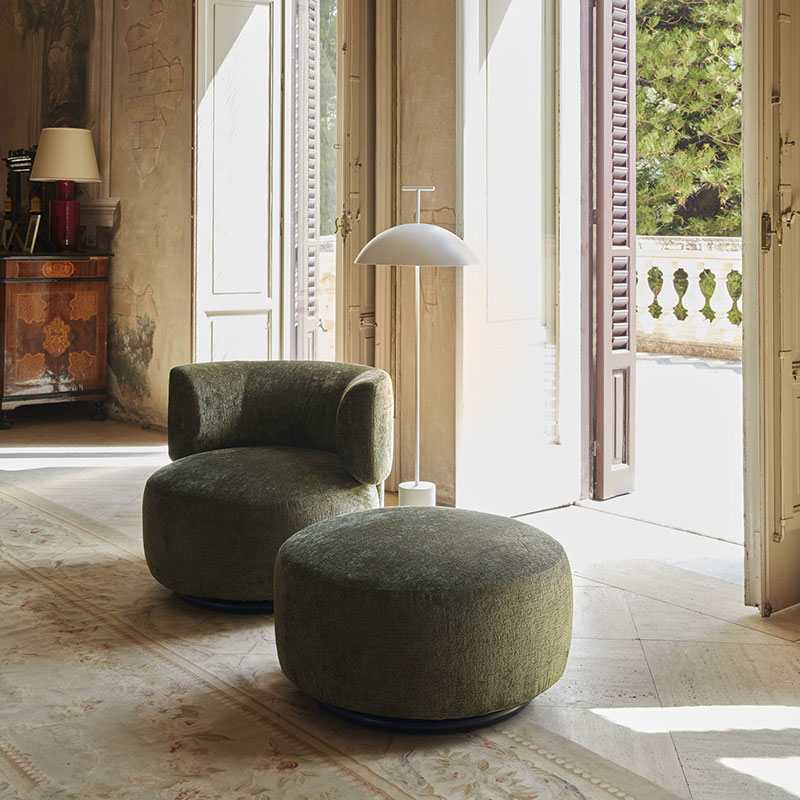 2つのソファとアームチェアは、背もたれを取り外すとラウンドプフに変身します。