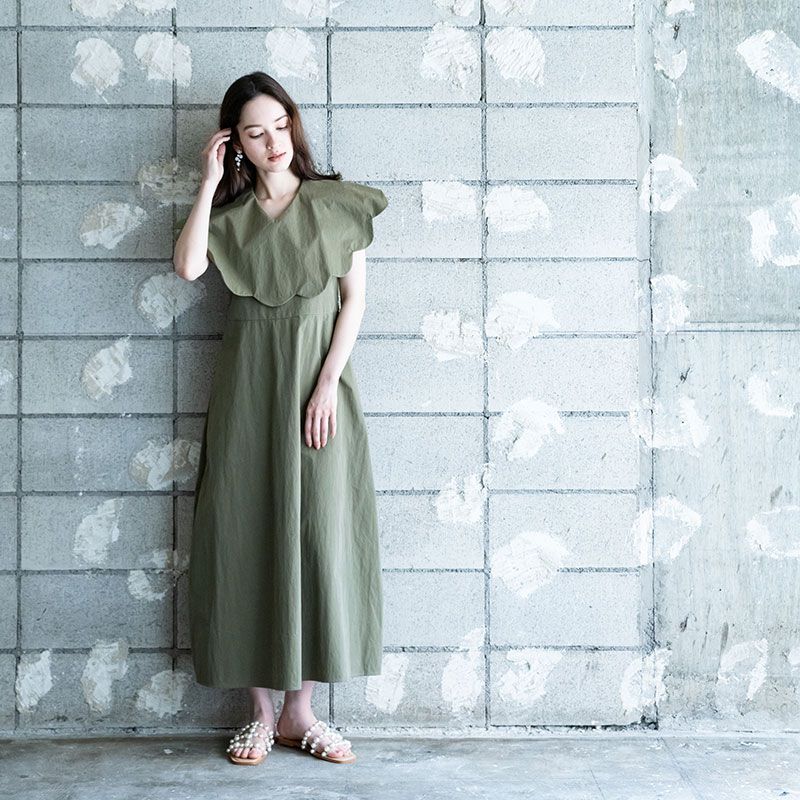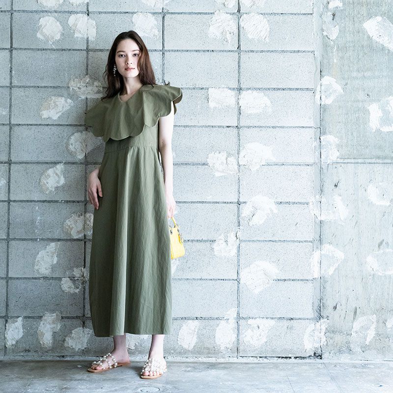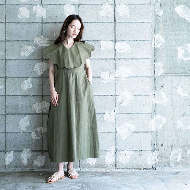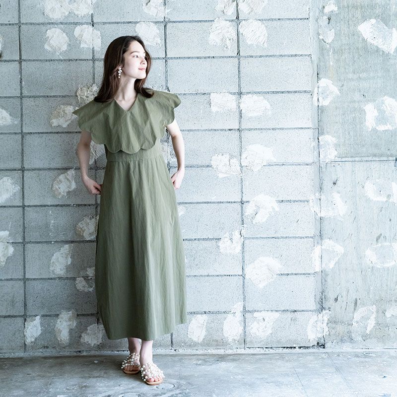 トレンドのスカラップが女性らしさを引き立てるサマーワンピース。ヴィンテージ風に仕上げた柔らかな風合いの生地が抜け感を演出します。