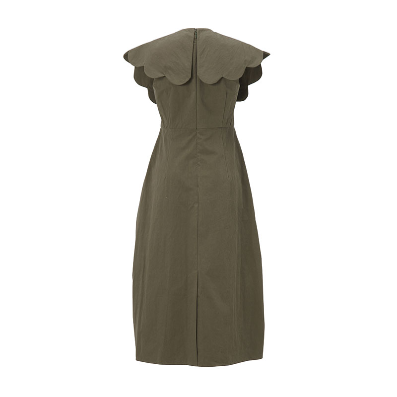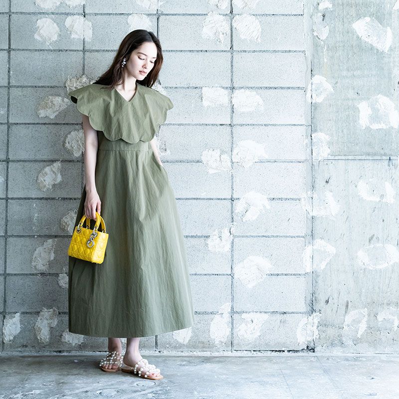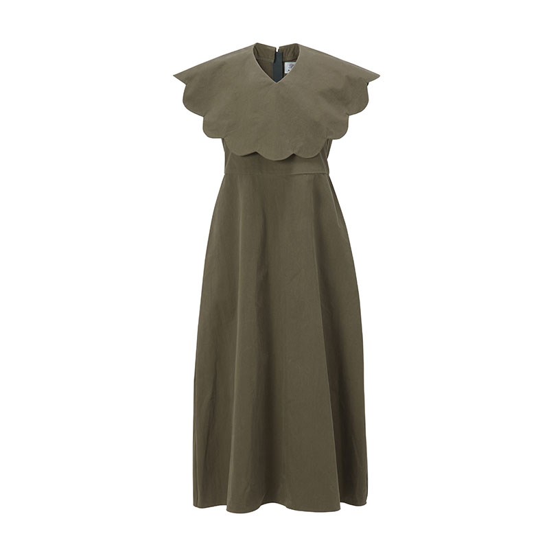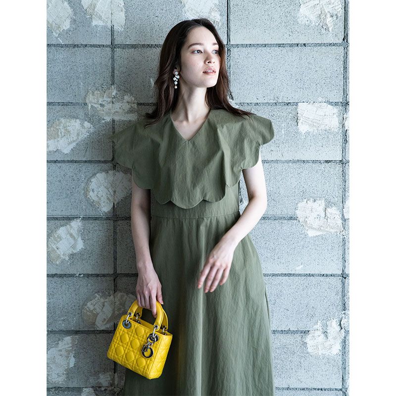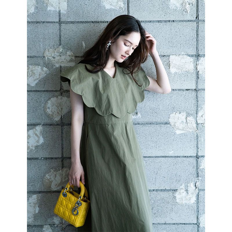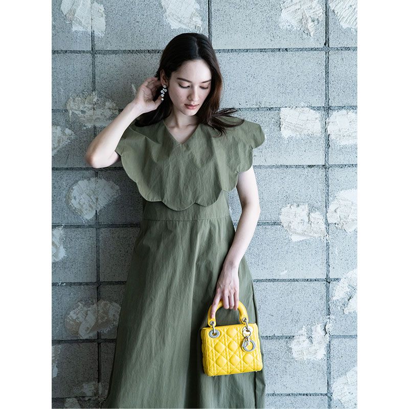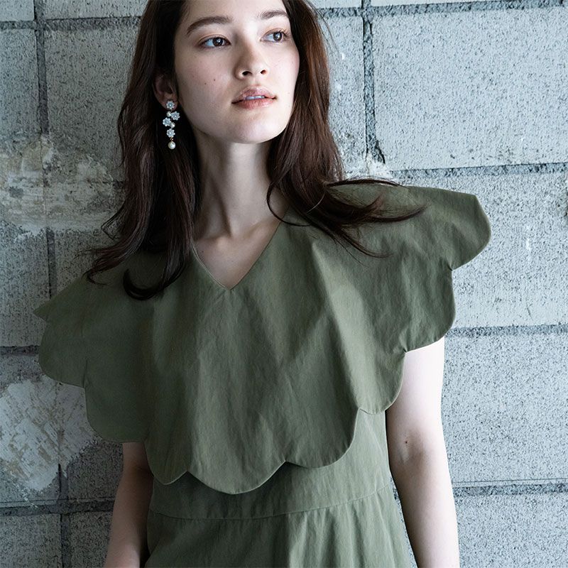 高めのウエストからの丸みを持たせたシルエットは、着るだけでスタイルアップが叶います。大きなスカラップの襟は、二の腕を華奢に見せてくれる嬉しい効果も。