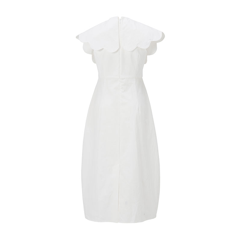 高めのウエストからの丸みを持たせたシルエットは、着るだけでスタイルアップが叶います。大きなスカラップの襟は、二の腕を華奢に見せてくれる嬉しい効果も。