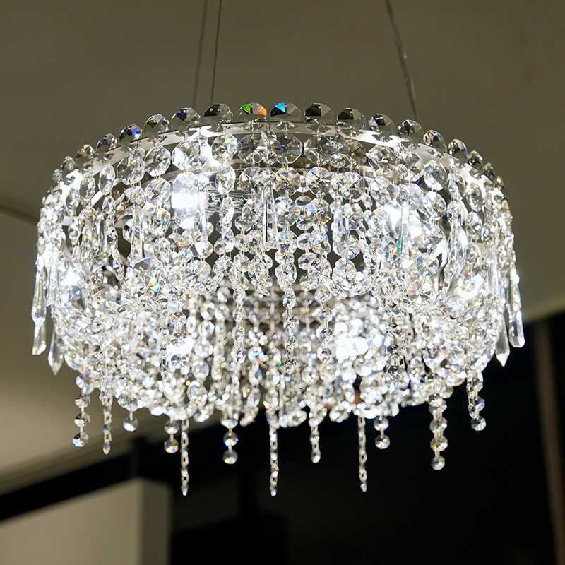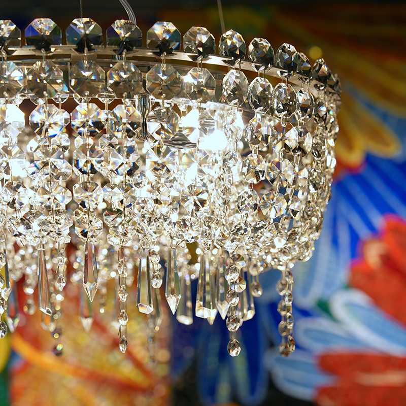 クリスタルビーズのオーナメントが連なり、雨のように降り注ぎます。小さなオーナメントが二重に重なり、光源からの光を、より複雑に拡散して輝きます。