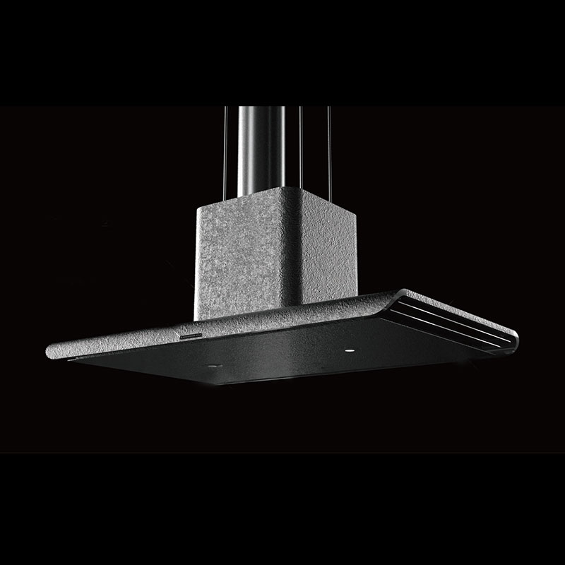 新開発のUFOが従来のレンジフードと異なるのは、サイドの3枚の羽です。4枚、5枚と羽を増やしたり、羽と羽の間の隙間サイズを変えてみたり、社内実験を何度も何度も繰り返し、もっとも煙を吸込む最適なサイドウィングを発見しました。それが、UFO独自の3枚の羽です。 上に行くほど広く伸びるウィング構造は、上に登ろうとする煙を段階的に捕集していきます。アイス仕様新登場