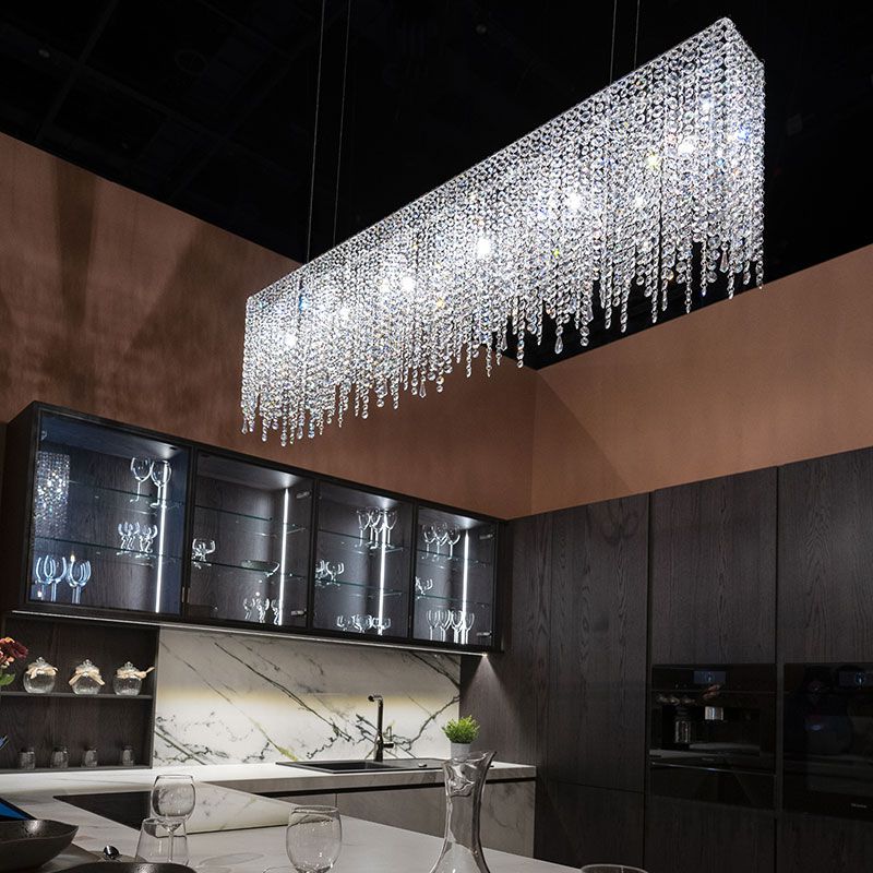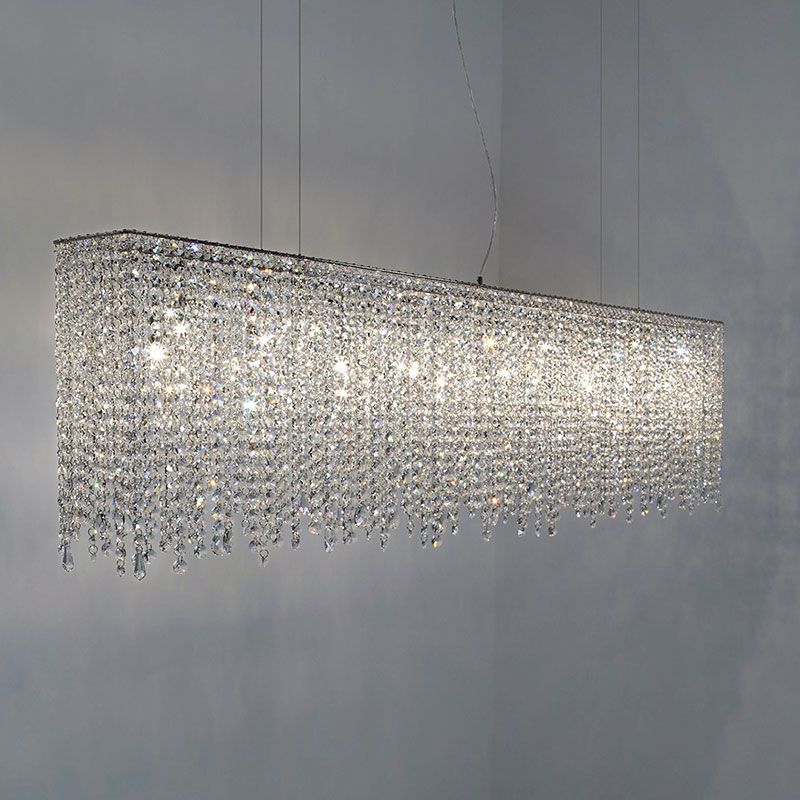 全体的なフォルムはスクエアで直線的。ランダムな長さのクリスタルビーズのオーナメントがカーテンのように光源をカバーし美しくきらめきます。