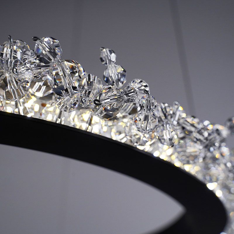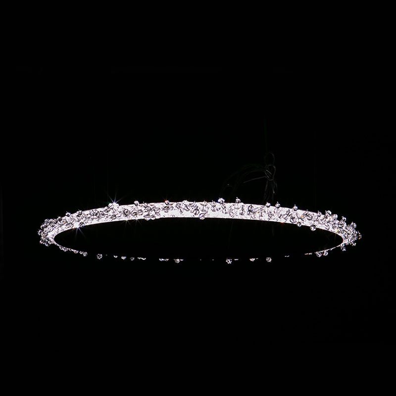 繊細なクリスタルビーズがクラスター状に円の周囲をまるく覆います、本体はミニマルで、まるで輝く光の輪が空中に浮いているようです。