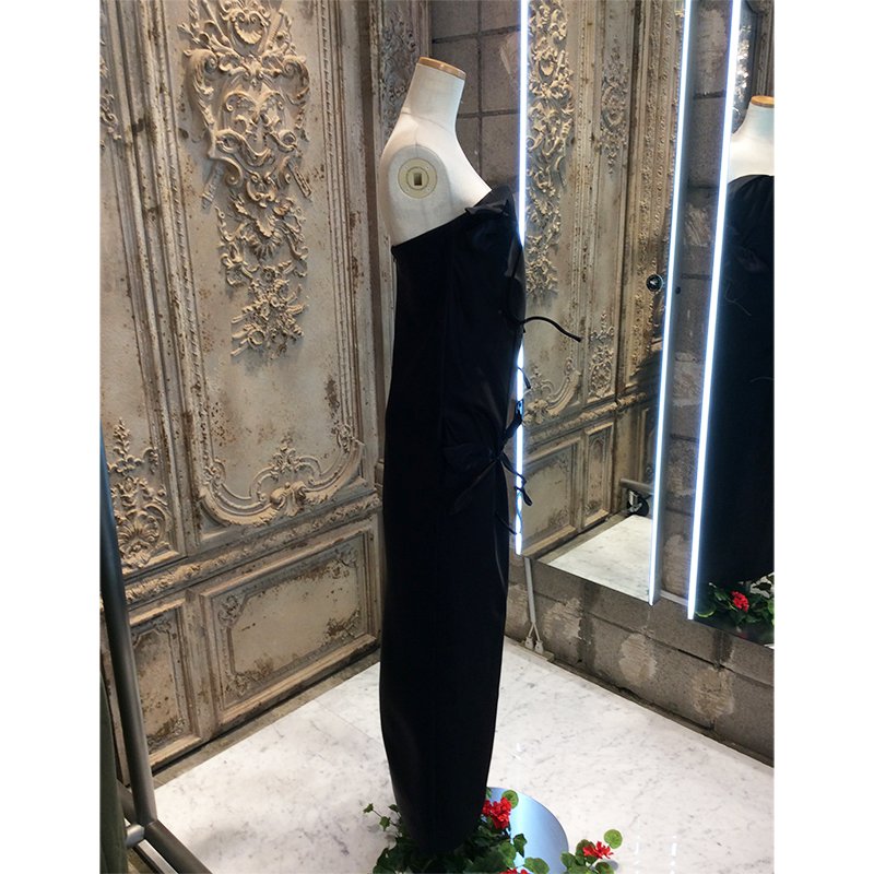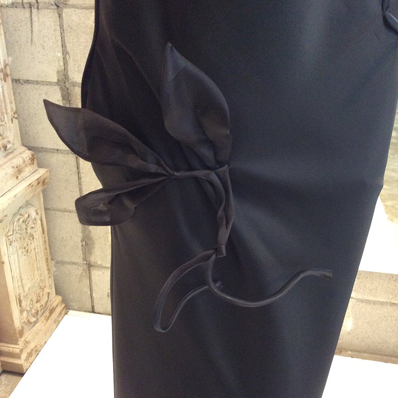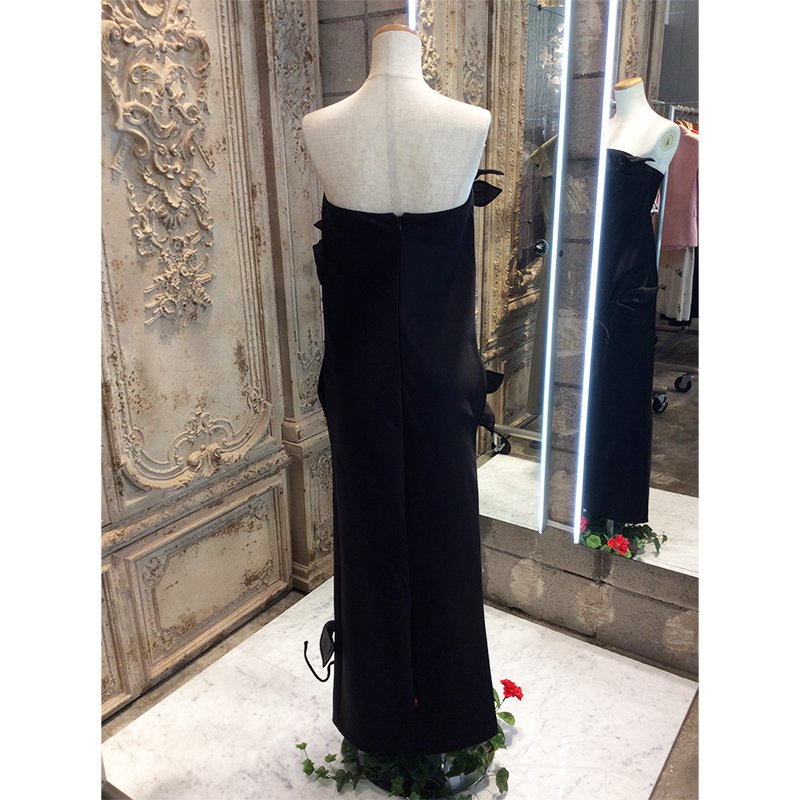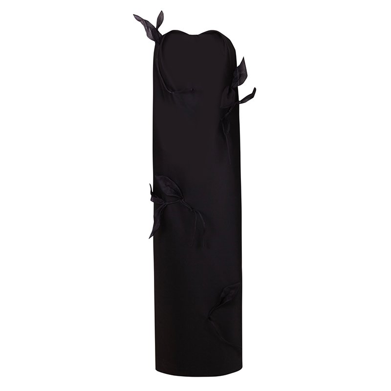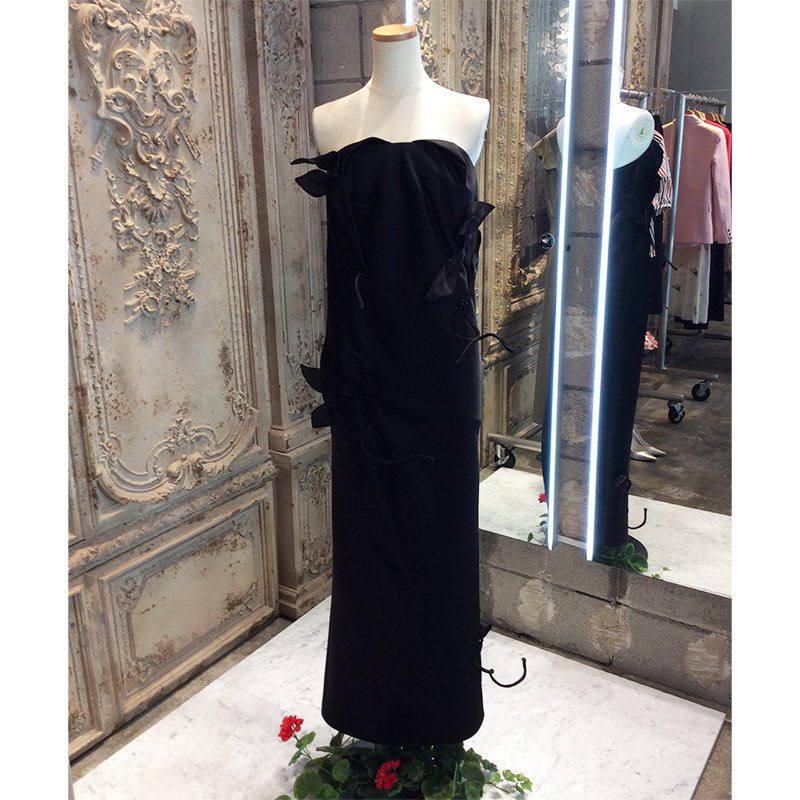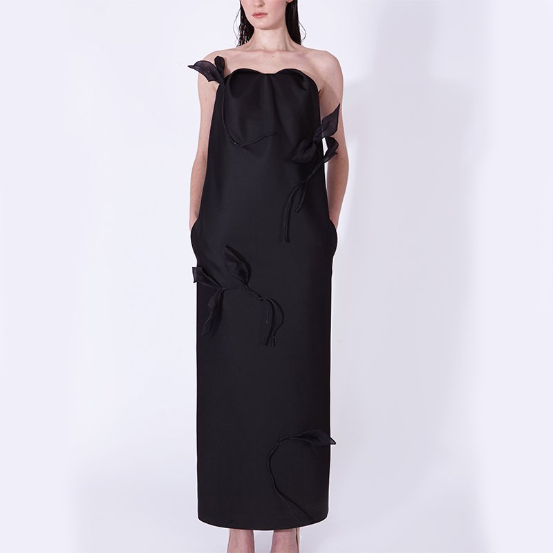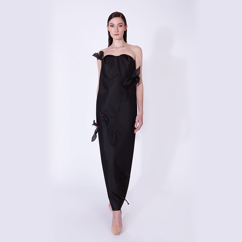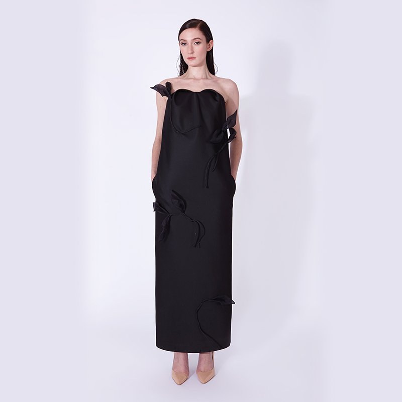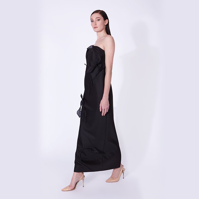 ネックラインにプリーツが入ったサテン製のストラップレス・ロングドレス。ハンドメイドのオーガンザ製リーフ型アップリケ付き。