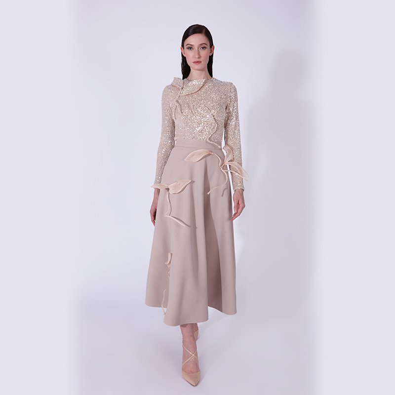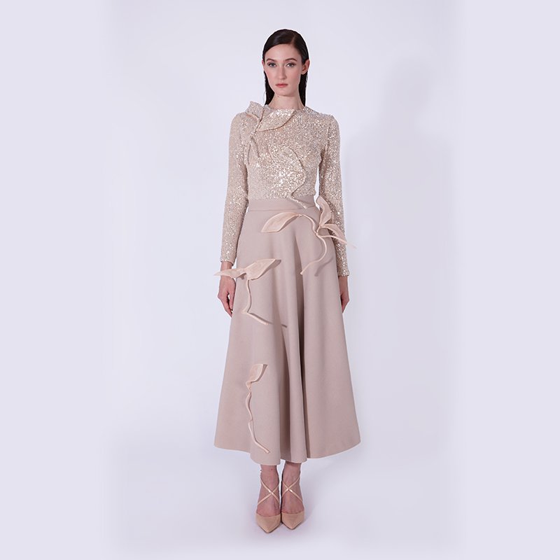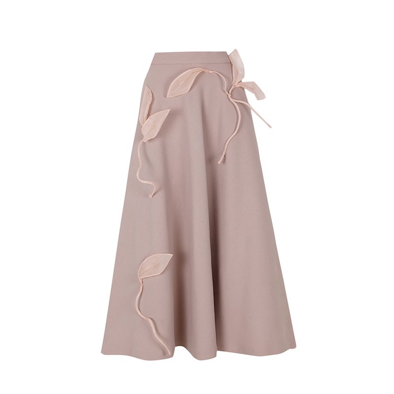 ウール製ミディレイヤードスカート、ハンドメイドのリーフ型アップリケ付き。