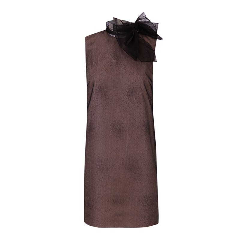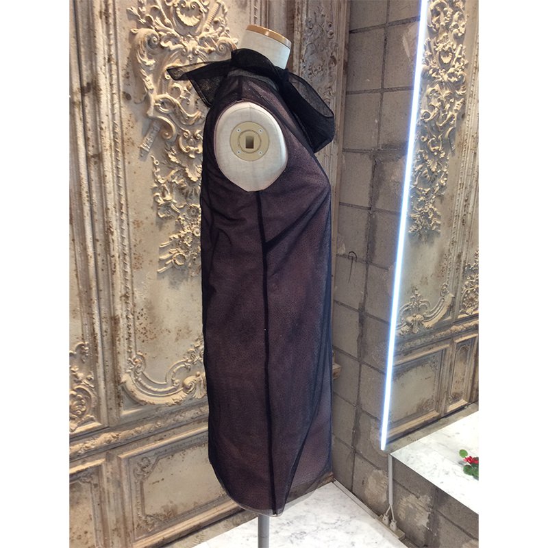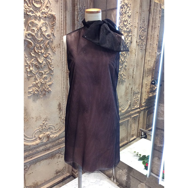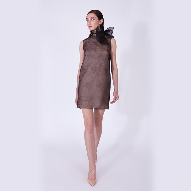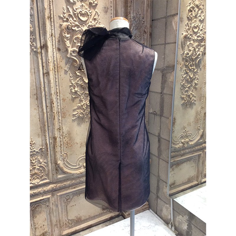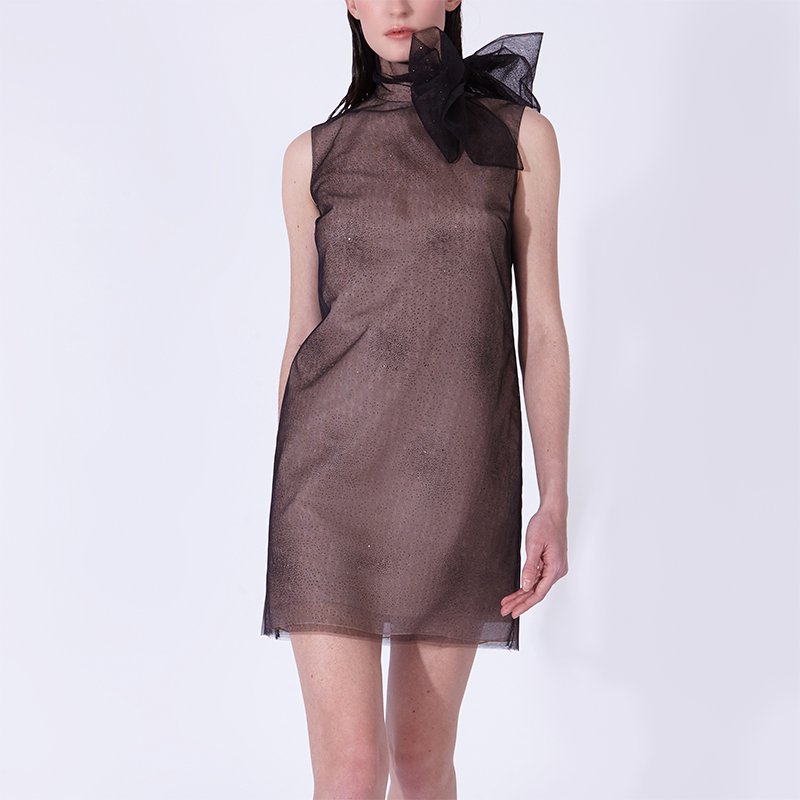 ホルターネックで首元にリボンがあしらわれたミニドレス。半透明のグリッター素材で、裏地付き。