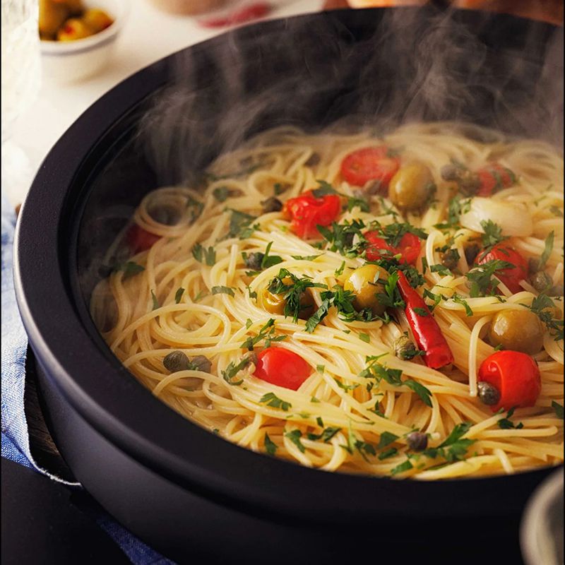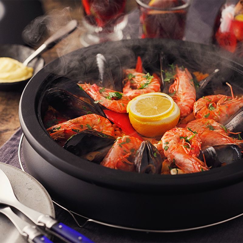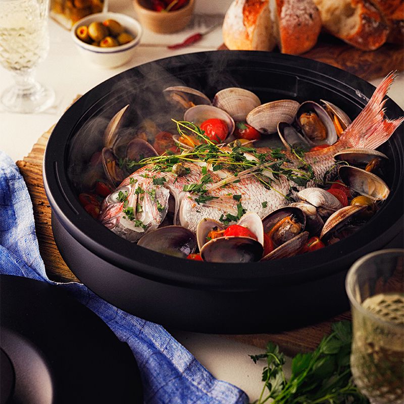 重厚なフタは、鍋の中を密閉し、遠赤外線効果で旨みを閉じ込めます。濃縮された旨みと瑞々しくふっくら仕上がる効果は、アクアパッツァやハンバーグなどに最適。