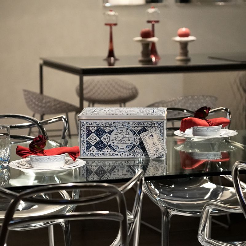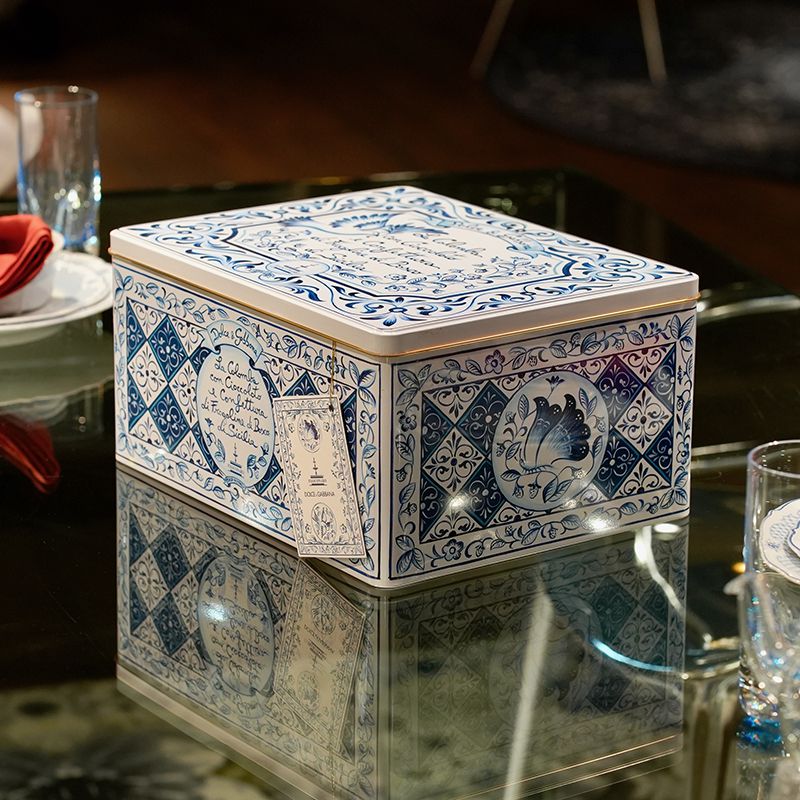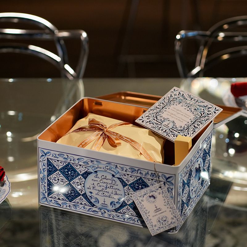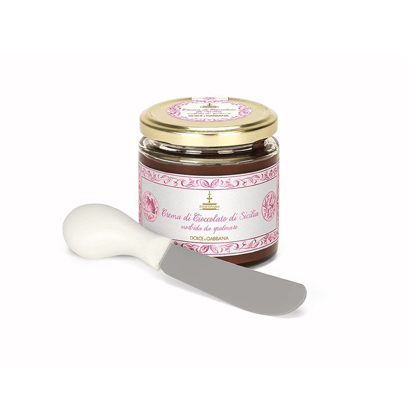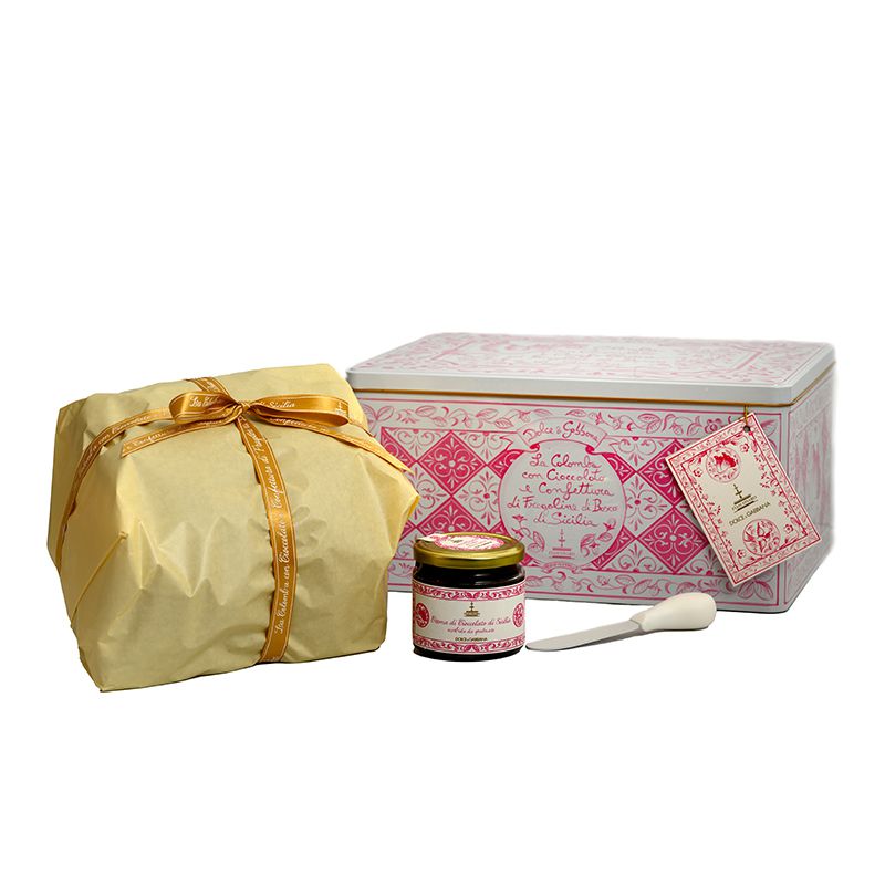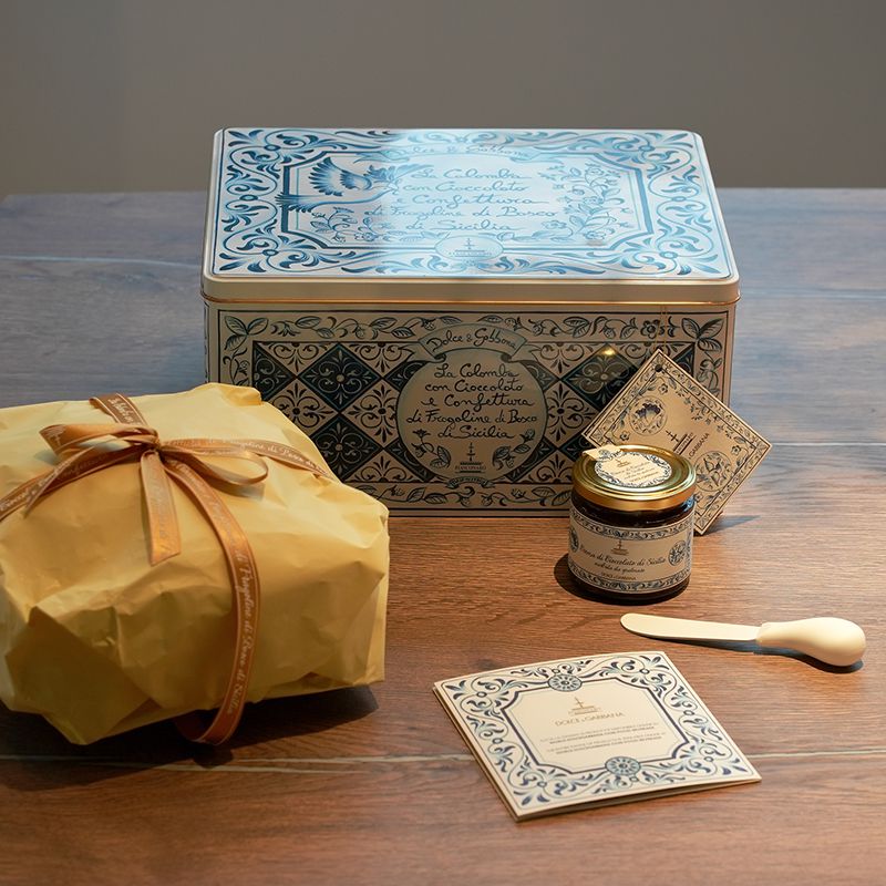 ドルチェ&ガッバーナオリジナルデザイン缶の中にコロンバとシチリアチョコレートのクリームがスパチュラと一緒に添えられています。