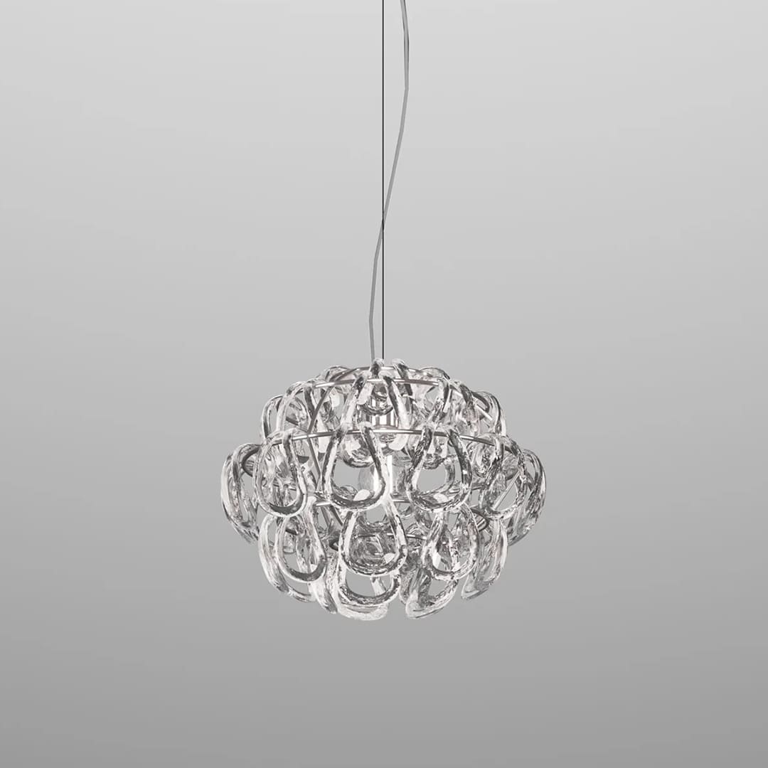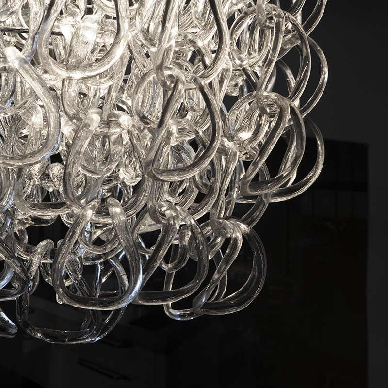 金属のアームや軸といった従来のシャンデリア構造を排除し、ガラスのオーナメントだけでフォルムを構成する革命的な照明です。