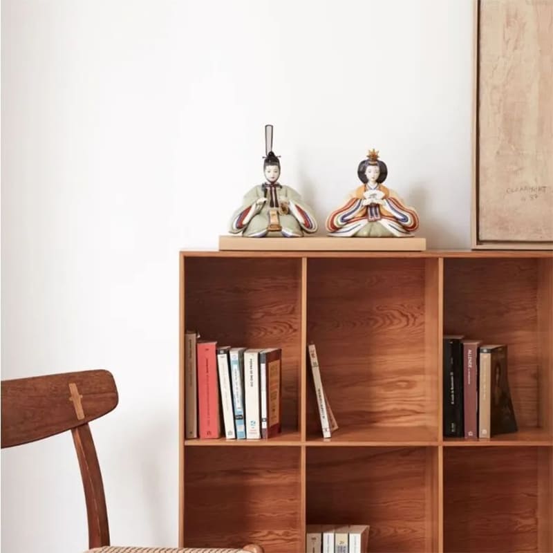 清々しく鮮やかな若草色と、あたたかく柔らかい薄橙色の着物をまとった可愛らしい雛人形。