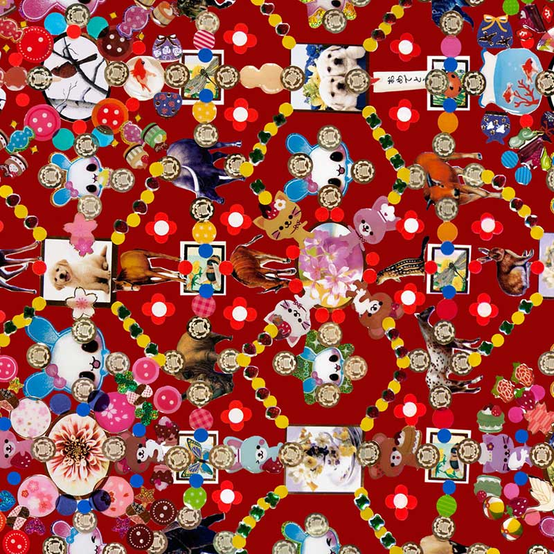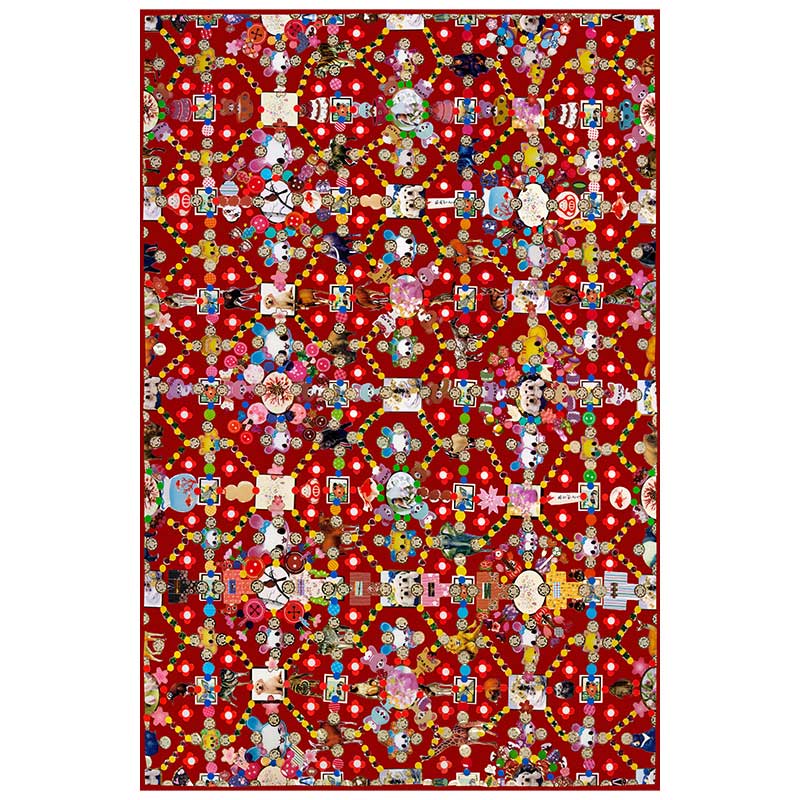 オブセッションとは「妄想」「取り憑かれる」を意味します。日本の雑貨店などで見つけられるようなハッピーなステッカー達を、まるでお祭り騒ぎのようにコラージュした作品です。背景色の違いで4つのバリエーションがあります。オリジナルは2013年Varoom Magazineで発表した「Obsession」という作品。近くで見ると感じる楽しげな印象も、遠くから見ることで伝統的なカーペットパターンへと変貌する不思議。