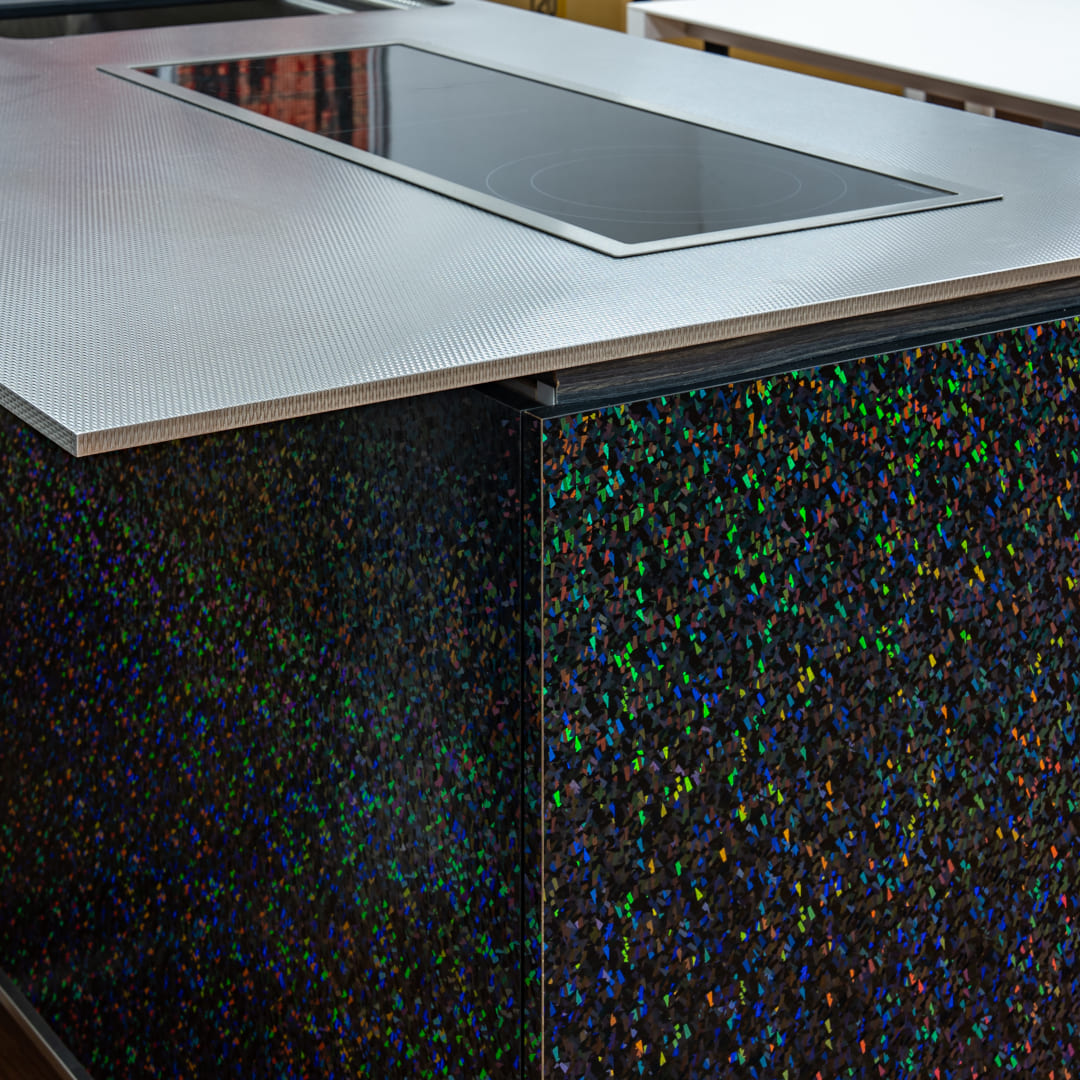 ステンレスにデザインを施した新感覚ワークトップ。美しいだけでなく、特殊なプレスパターンによって傷がつきにくく目立ちにくいため、永く美しく使い続けられます。