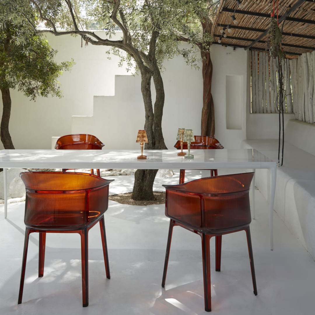 Bouroullec兄弟がKartellのために、コンセプチュアルで洗練された透明ポリカーボネート製のアームチェアPapyrusをデザイン。シンプル、洗練、優美、そしてややレトロな雰囲気が見事に融合されたPapyrusは、昔ながらの単純な構造の籐イスからヒントを得て造られました。半透明で丸みがあり優しく包み込むような背もたれの表面には、細い縦縞模様が施され、軽量なのに座り心地は抜群です。