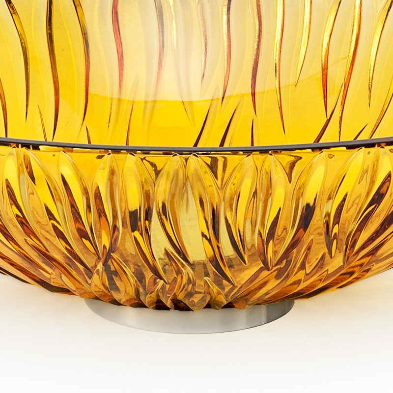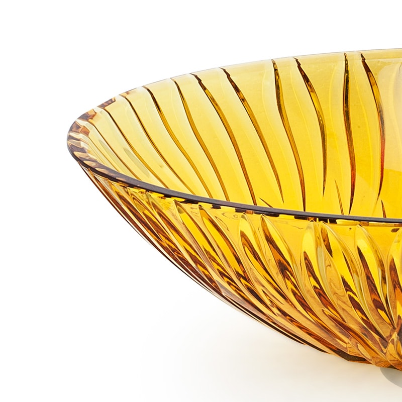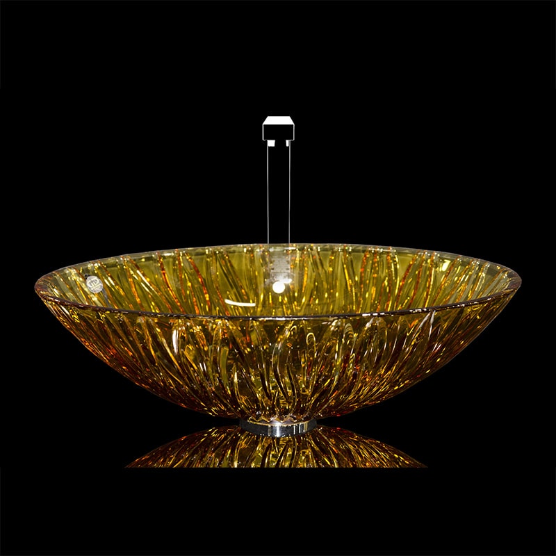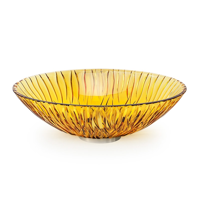 アンバー色のガラスが美しい洗面ボウル。周囲に施された花びらのようなカッティング模様が特徴的です。