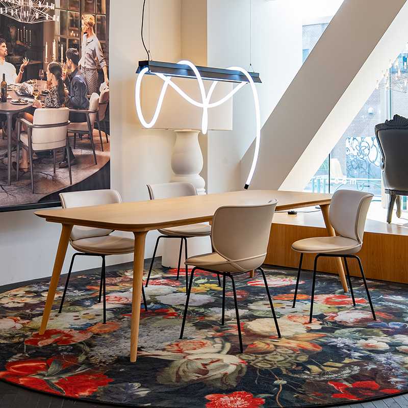 直線的な脚部とのコントラストにより、柔らかく流れるような有機的なフォルムを引き立たせます。