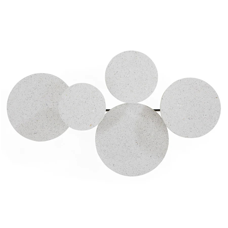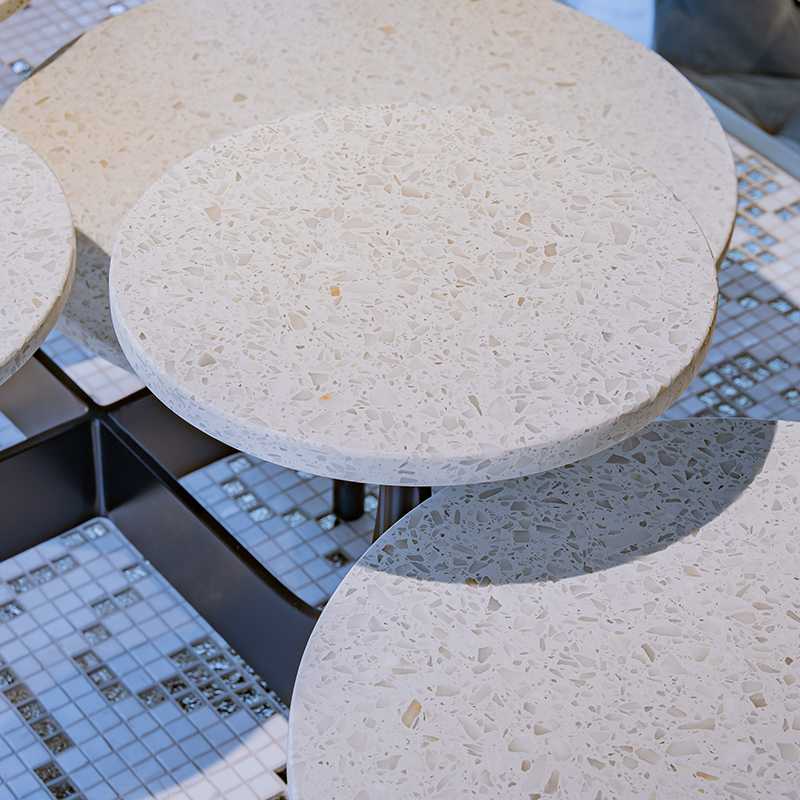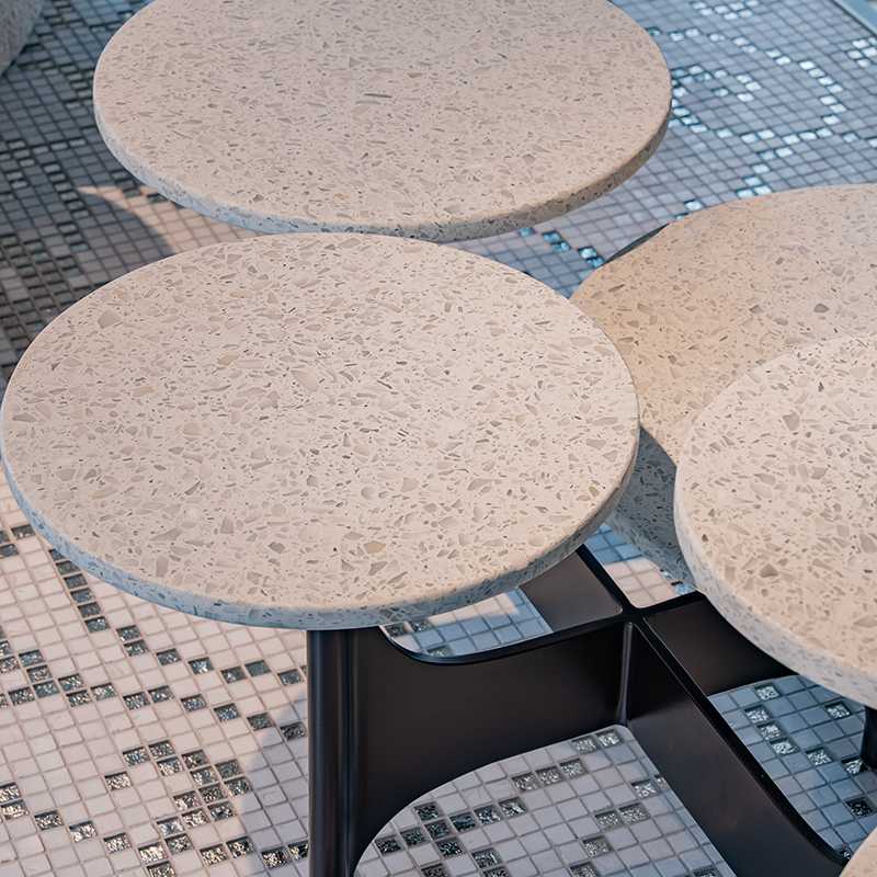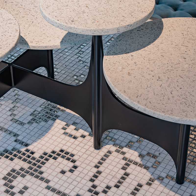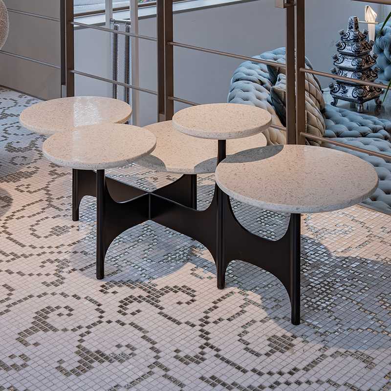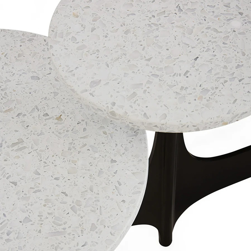 モダニズムの建築家オスカー・ニーマイヤーの建築にインスパイアされた5つのテラゾー製のテーブルトップと彫刻的な黒染めスチールのベースが特徴です。